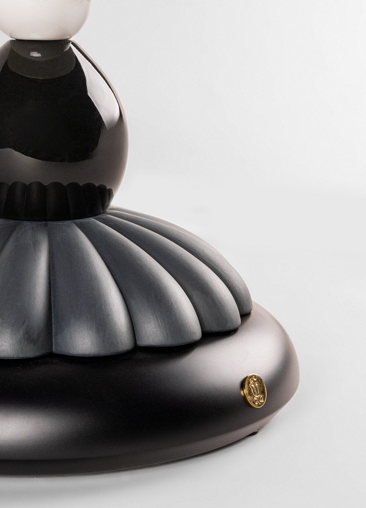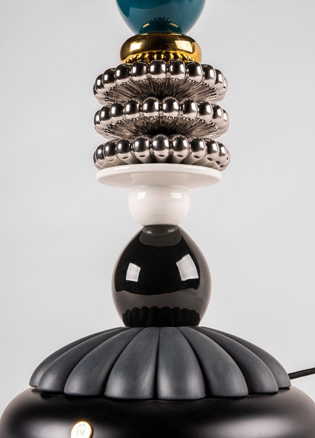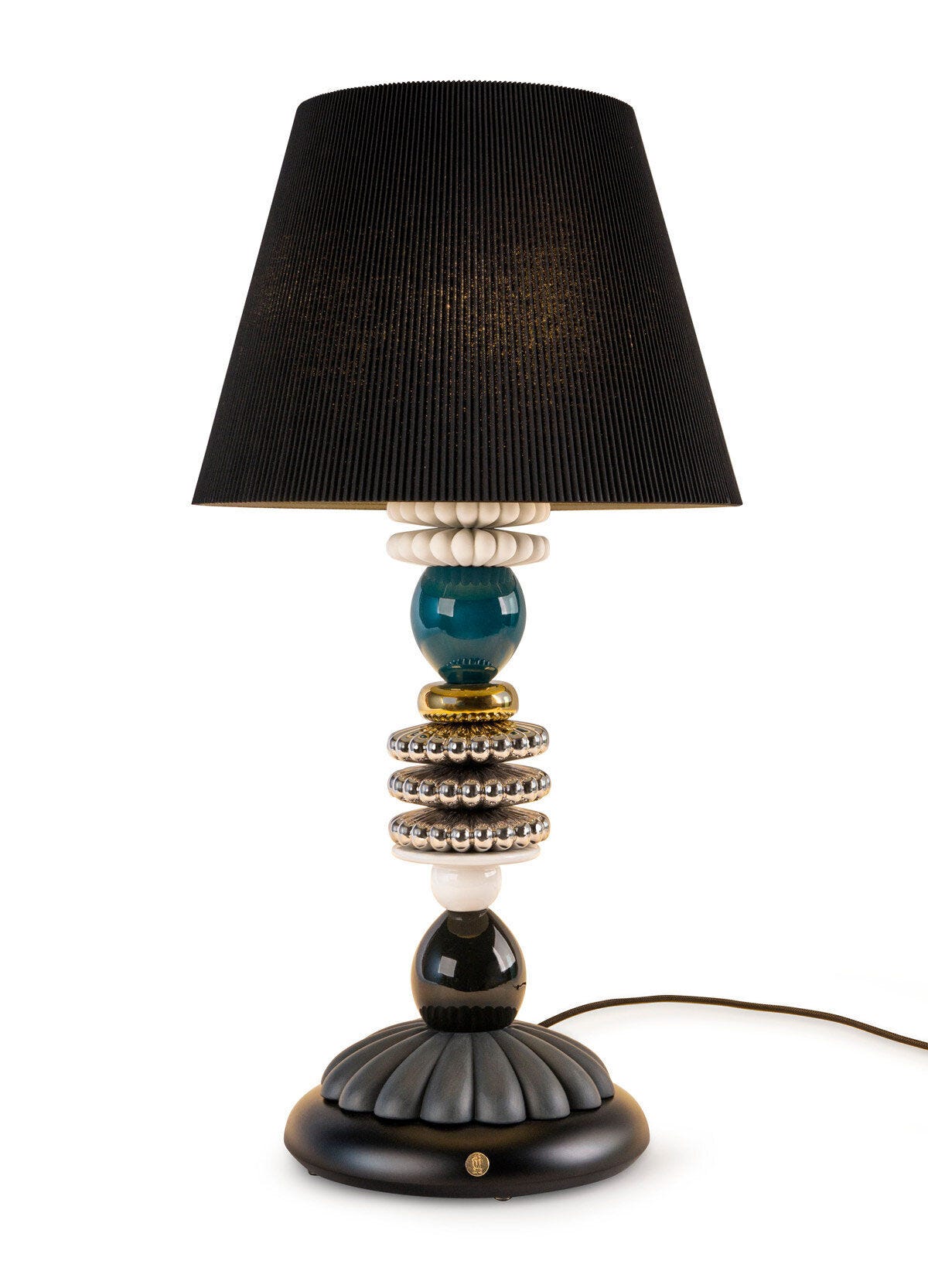 Olga Hanono, an interior designer internationally famous in the world of art and architecture, uses her bold disruptive style to bring a new focus to the Firefly collection, to which this tabletop lamp is the latest addition. Like the rest of the lamps in the collection, the decoration of this creation features metallic colors and black to contrast with the purity of white porcelain. The lamp shade is black fabric with a golden inner lining to produce a warm, elegant light.