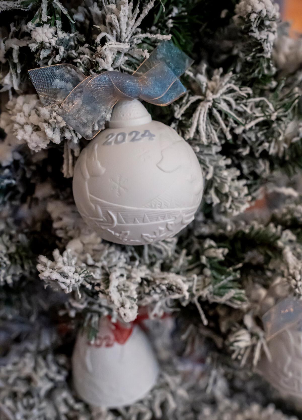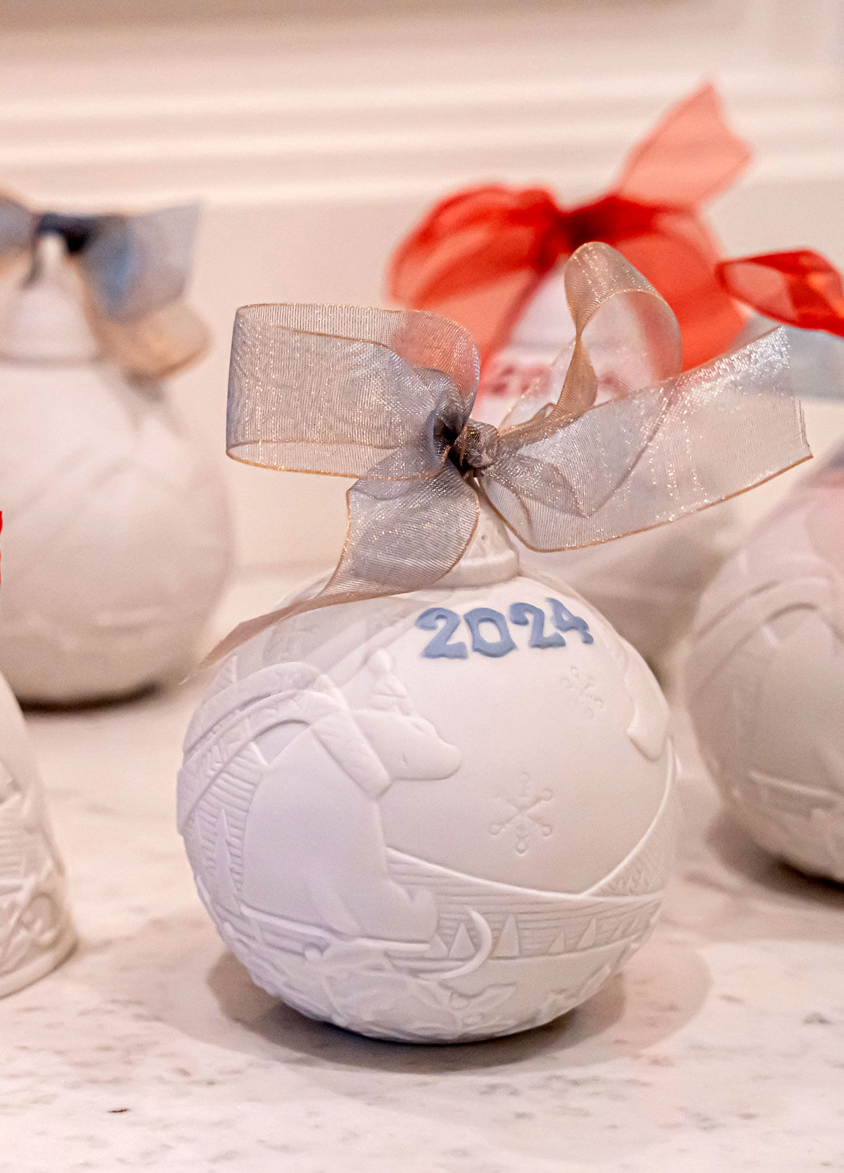 A must-have ornament for the holiday season. An all-time classic in our catalogue that brings joy and tradition to decorating the home at Christmas. Matte porcelain ball etched with a fun-loving winter scene featuring polar bears pulling a sleigh through the snow. The year is highlighted in blue.