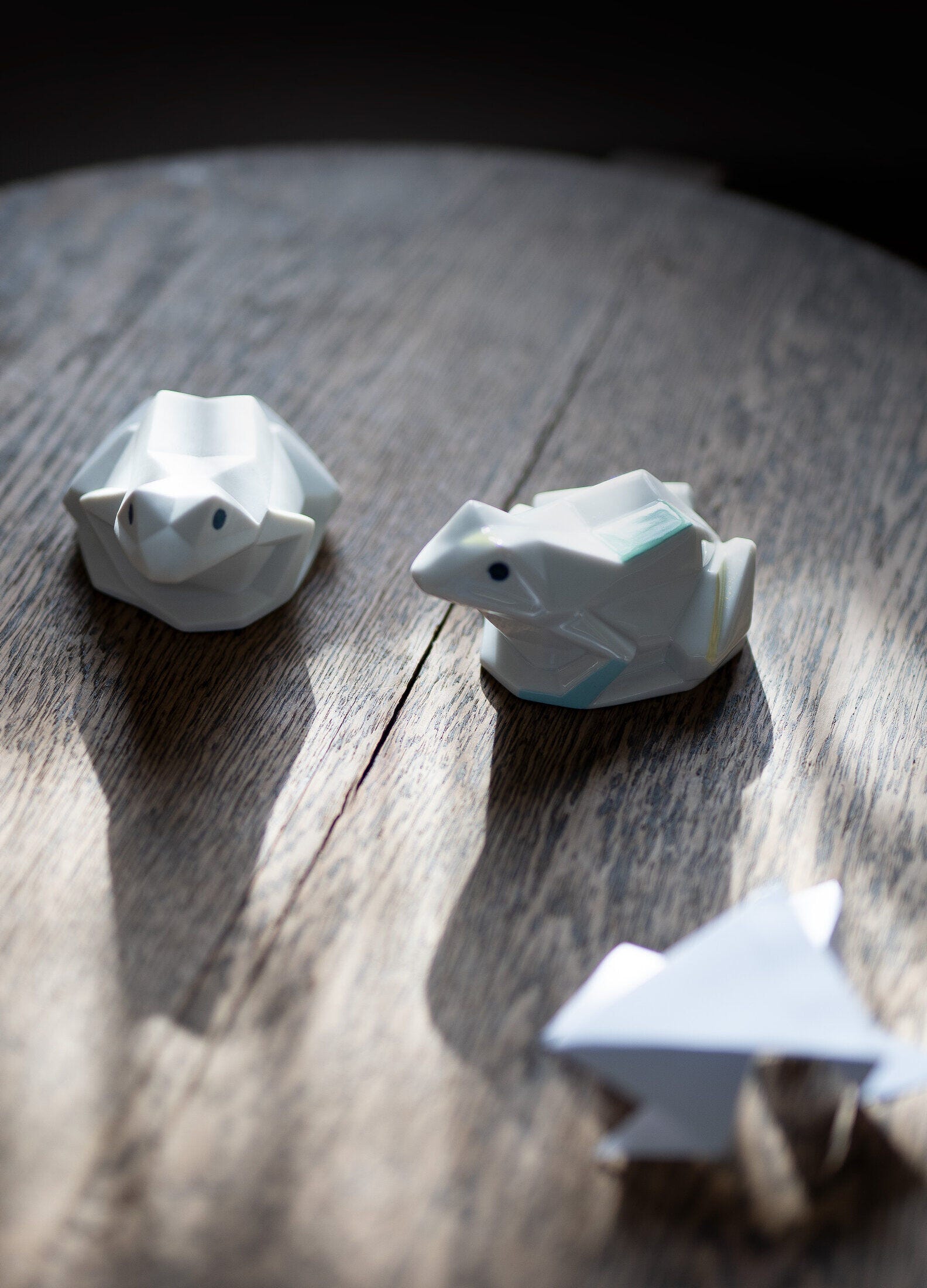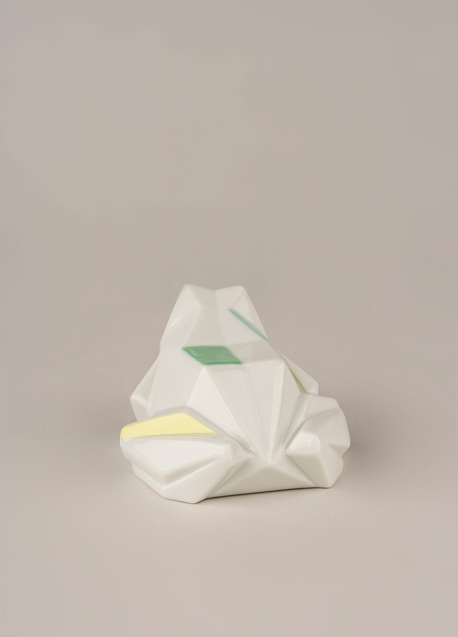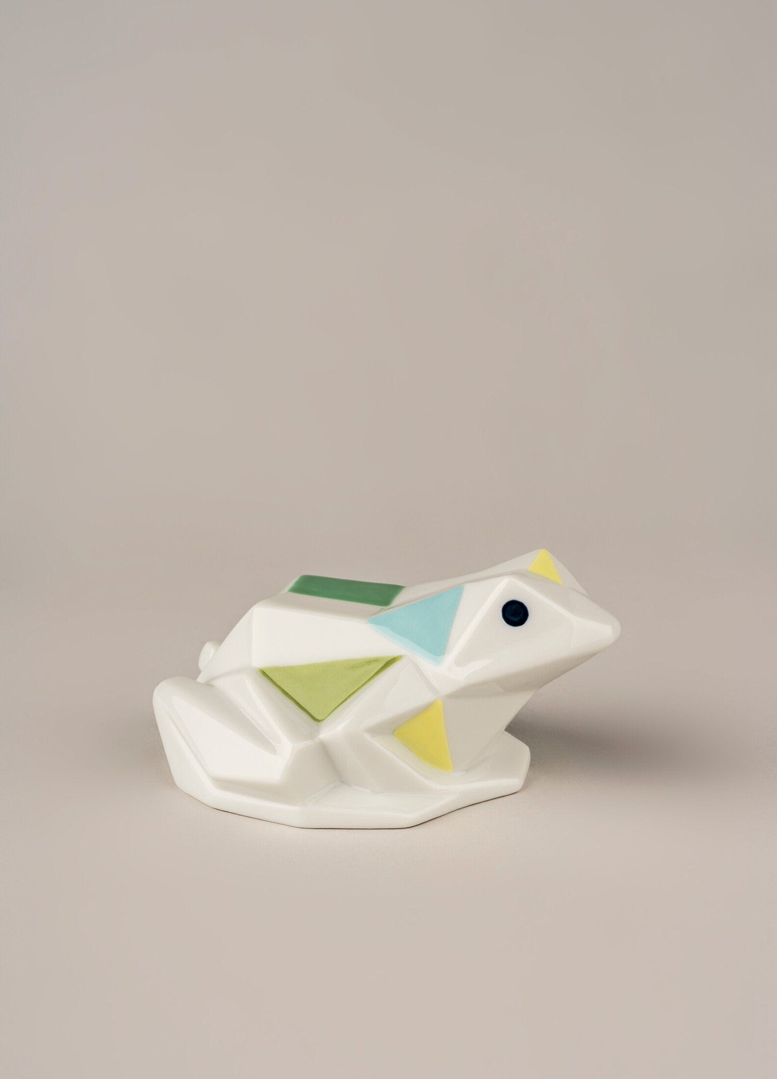 Glossy porcelain frog figurine in decorated with green and yellow colors belonging to the origami collection.