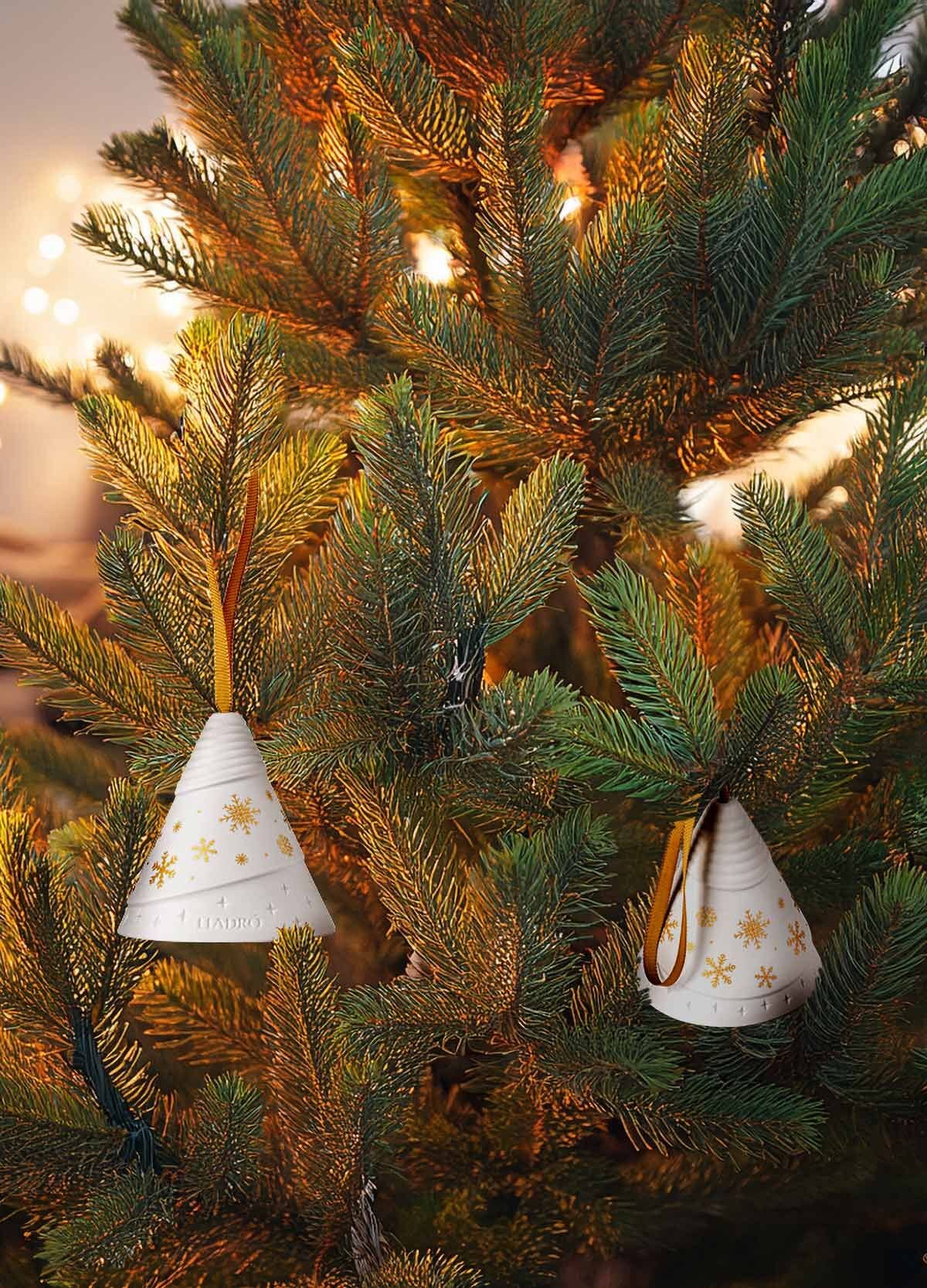 Happy Holidays is a matte white porcelain ornament, handcrafted and hand decorated. Its conical design features snowflakes painted in golden luster, engraved stars, and a subtle line pattern in relief. A creation that captures the charm of winter landscapes and the warm glow of festive lights.