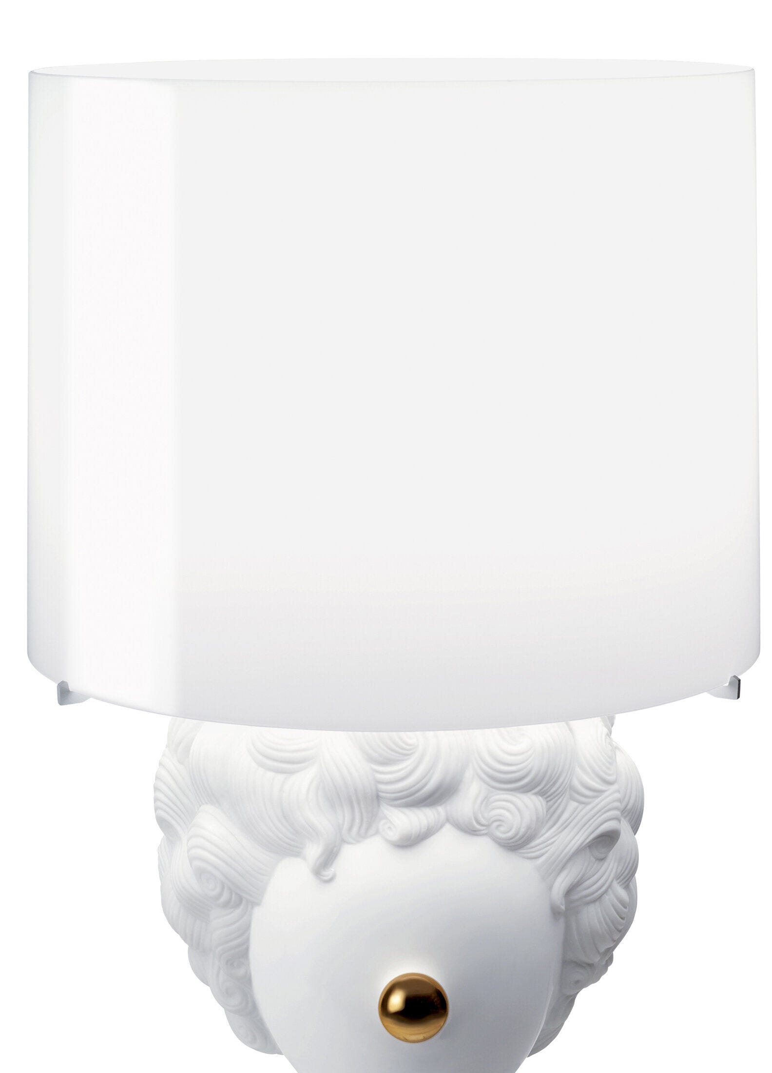 Table lamp designed by Jaime Hayon in white glossy porcelain with modern design and golden sheen on the nose, where you can find the switch that regulates the intensity of light.