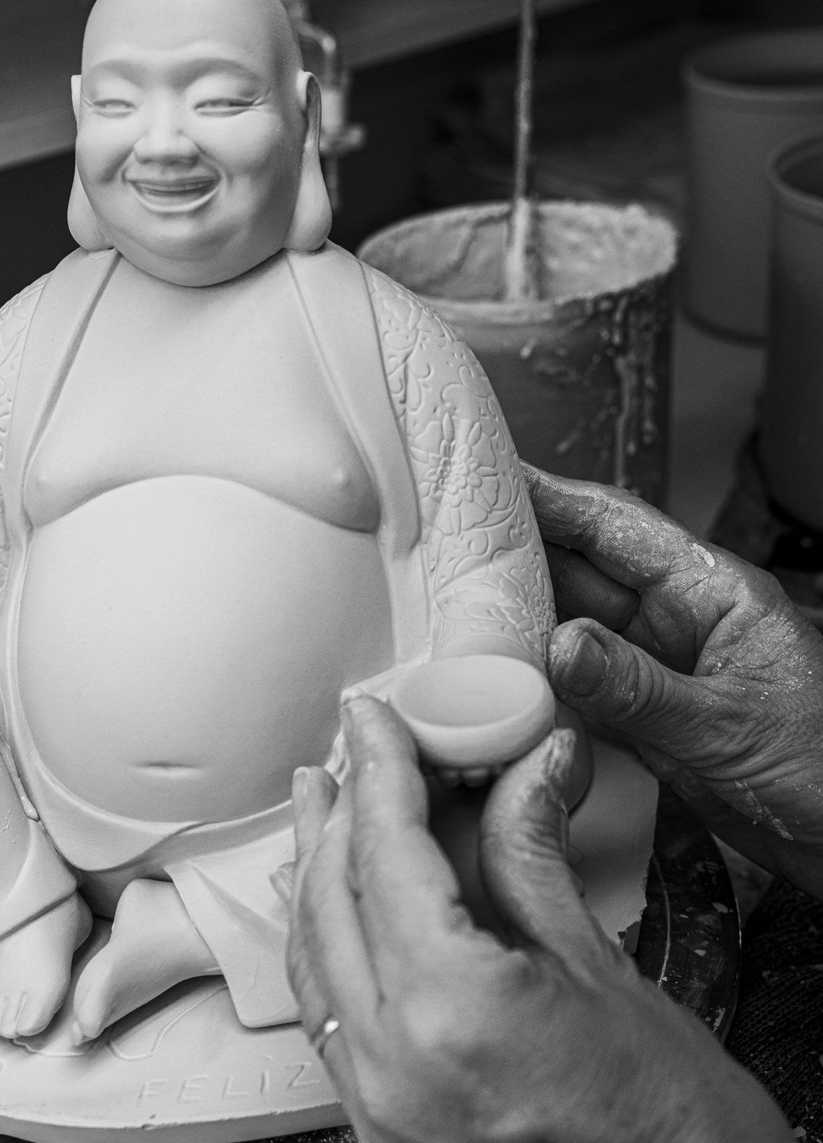 According to tradition, anyone who wishes to become an apprentice of the Buddha must first learn from the Maitreya Bodhisattva, known as The Happy Buddha and fulfil the basic conditions: a smiling face and a big heart, represented by his bulging belly. A matte white porcelain piece, decorated in enamels.