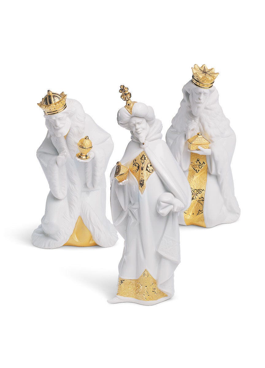 The Three Wise Men, key figures in the traditional Nativity scene, made in matte white porcelain, decorated with touches of glazed golden luster.