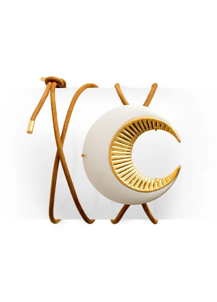 Bracelet and pendant made in porcelain inspired by the magic moon, the symbol of Diana, the Roman goddess of hunting and protector of nature. The crescent moon is the main motif in these pieces of jewelry in white porcelain decorated with golden luster and a soft leather cord.