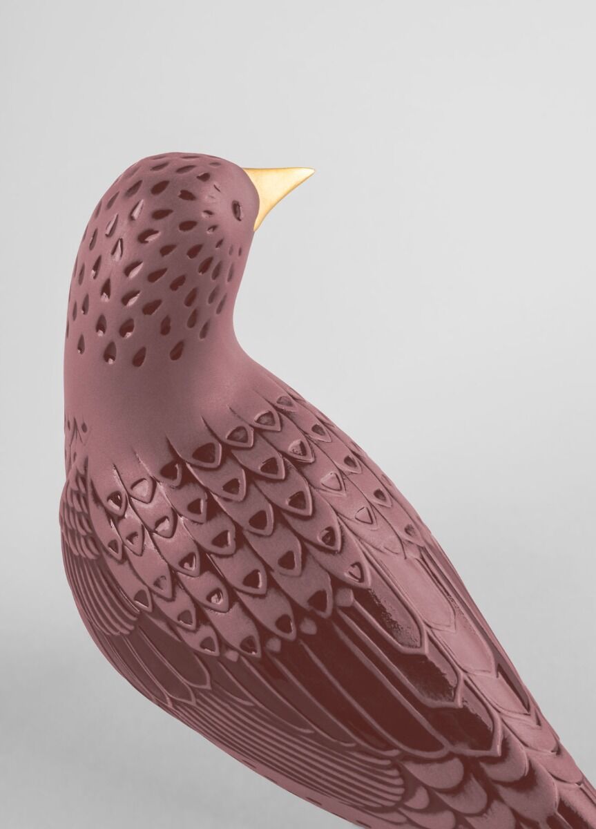 The starling is a small bird that nevertheless offers one of nature’s most beautiful sights when they flock together and fly as one in what is known as a murmuration. When flying in flocks these little birds synchronize their movements to form amazing patterns that cover the sky like dancing clouds. Lladró artists have focused on the bird’s unique iridescent black feathers, with green and purple sheens, captured in these starlings in the minute ornamentation. In the black and the purple versions, the single-color tone enhances each one of the feathers covering the little birds.
