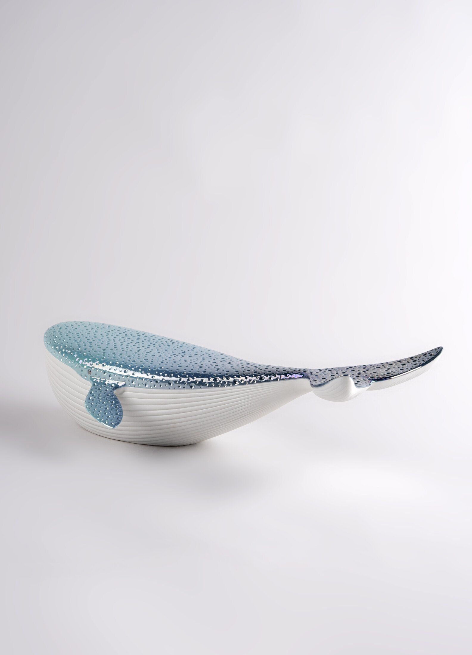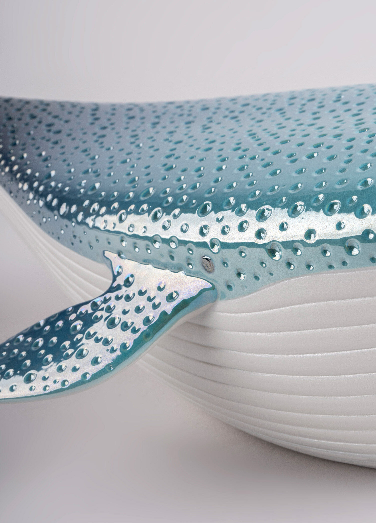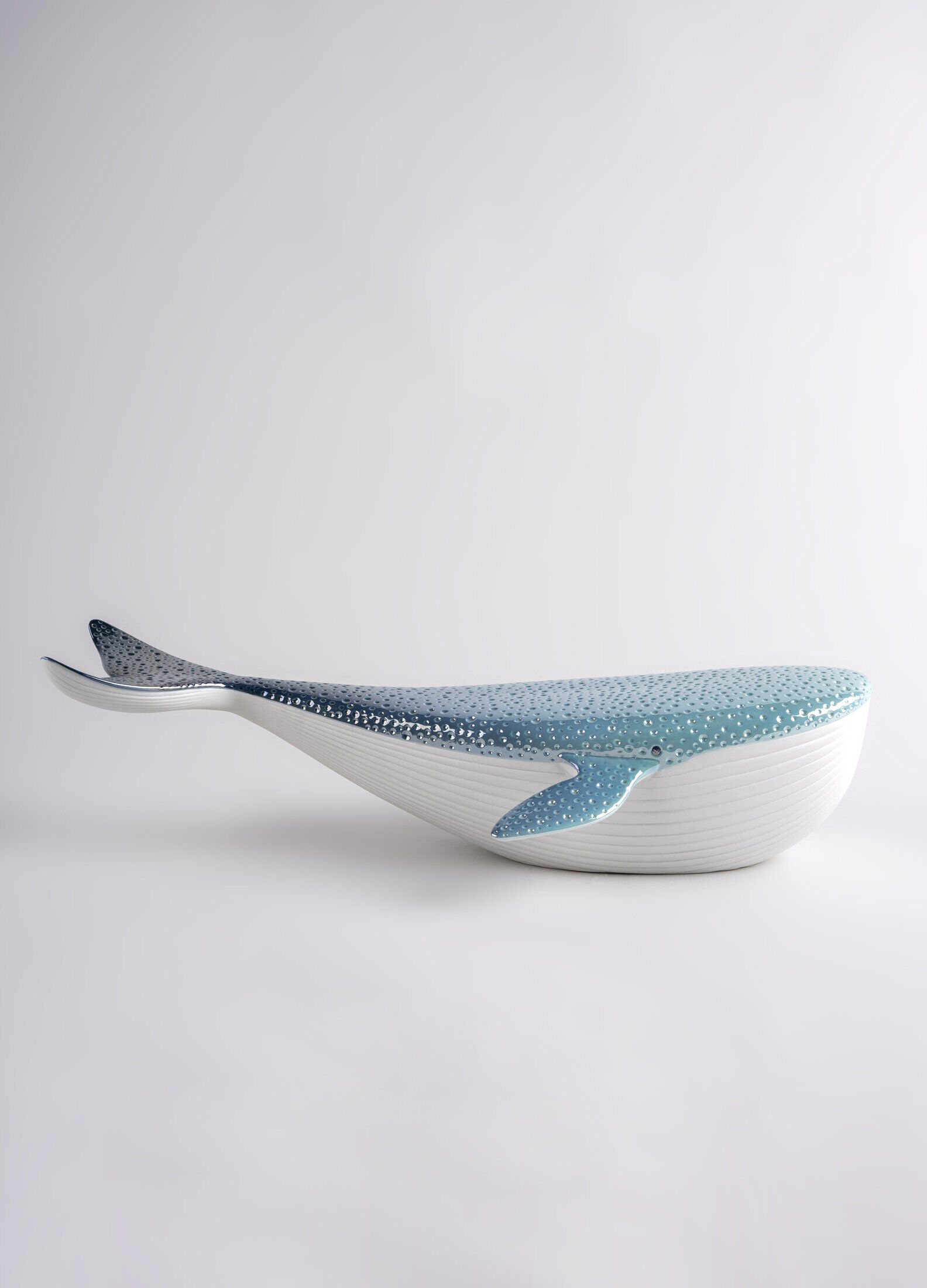 Pieza de concepción contemporánea y muy decorativa, representa a uno de los animales más grandes, impresionantes y bellos del mundo. Una criatura mítica llena de simbolismo que es el regalo perfecto para todos los amantes del mar y de la naturaleza. Está realizada en una combinación de porcelana mate y brillante. La parte inferior es de color blanco mate con un grabado de líneas horizontales. La parte superior está decorada mediante la aplicación aerográfica de un fundido de dos esmaltes que forma un degradado. Además, toda la escultura está finalizada con la aplicación de un perlado.
