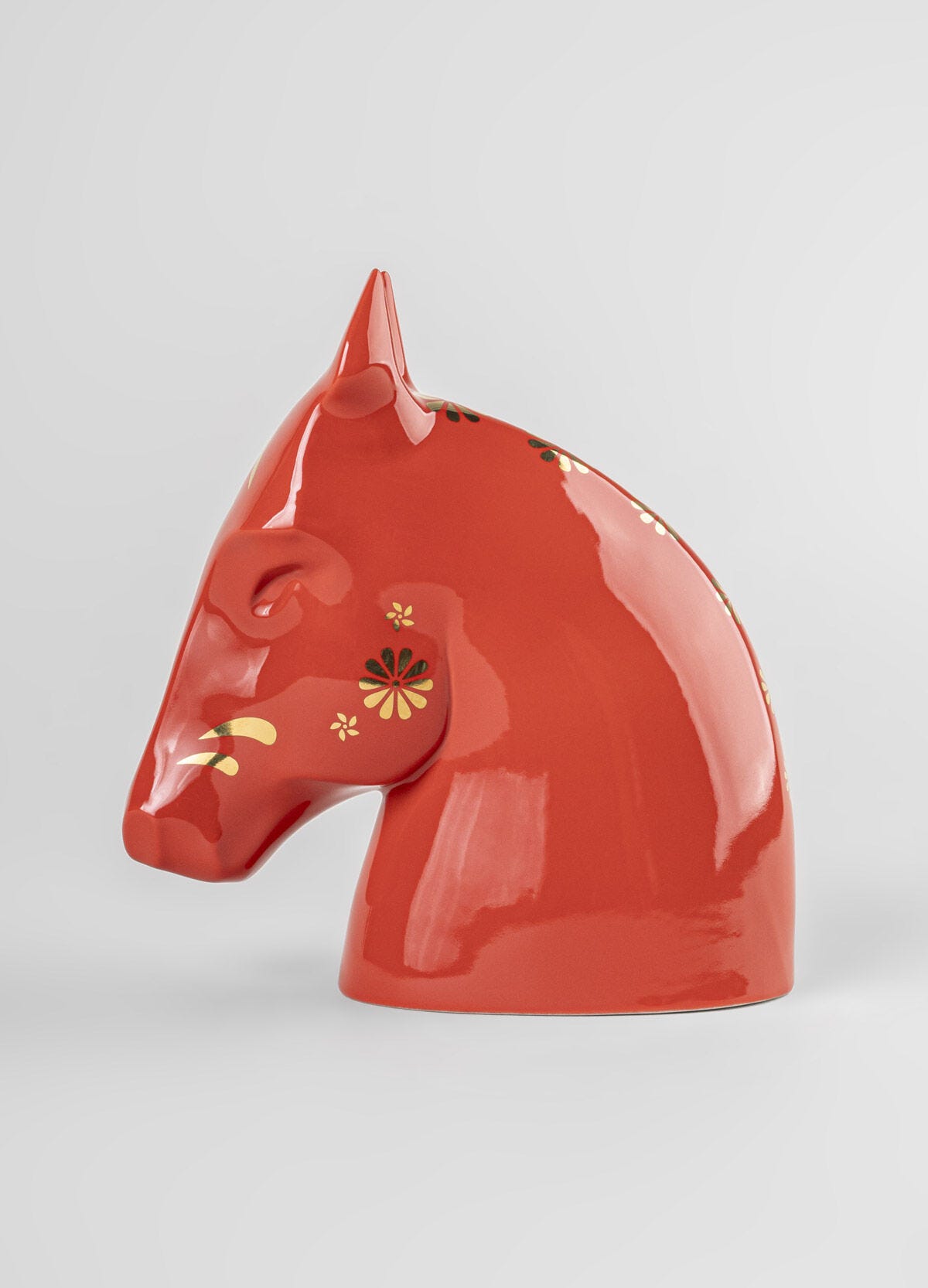 El Caballo (rojo-oro) forma parte de una colección que reinterpreta los doce animales del Zodiaco Chino desde un tratamiento de las formas más depurado. Esta serie busca capturar la esencia de una tradición milenaria mediante un lenguaje que se aleja de una visión realista. A partir de ahí, surgen propuestas como esta cabeza de caballo, de líneas primarias y decoración bicolor.
