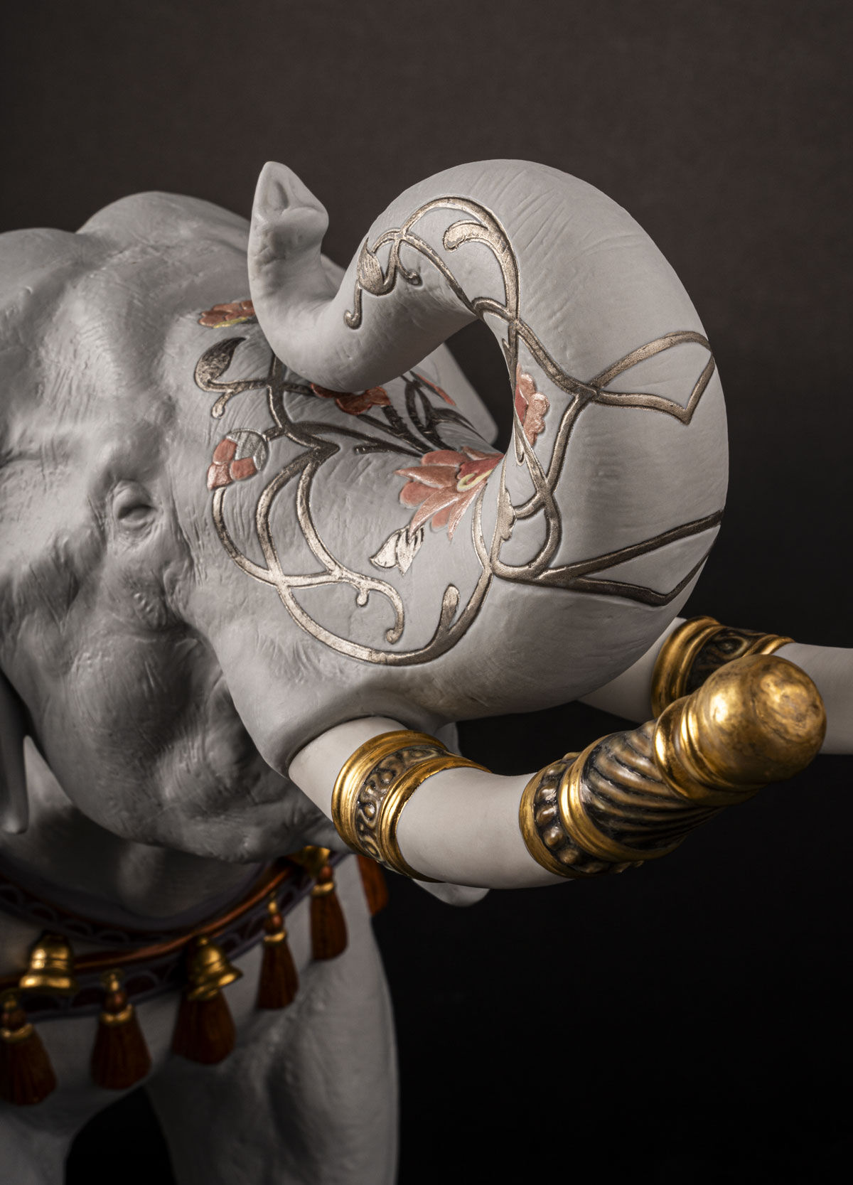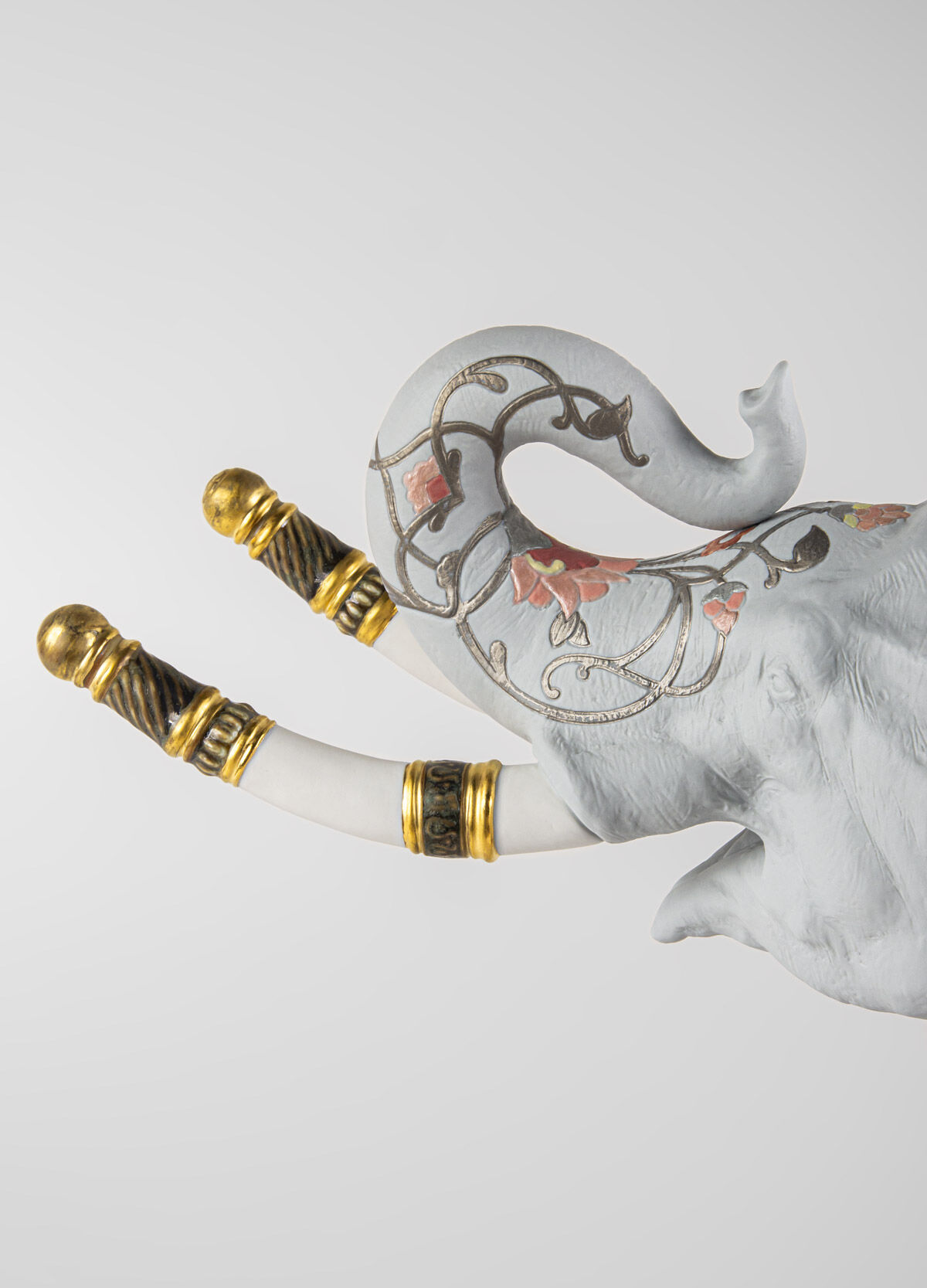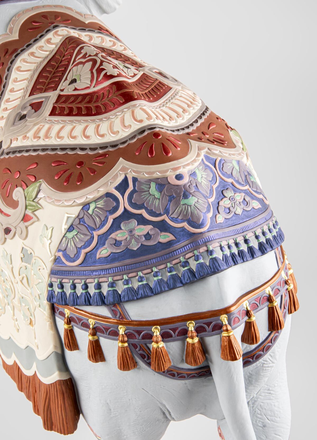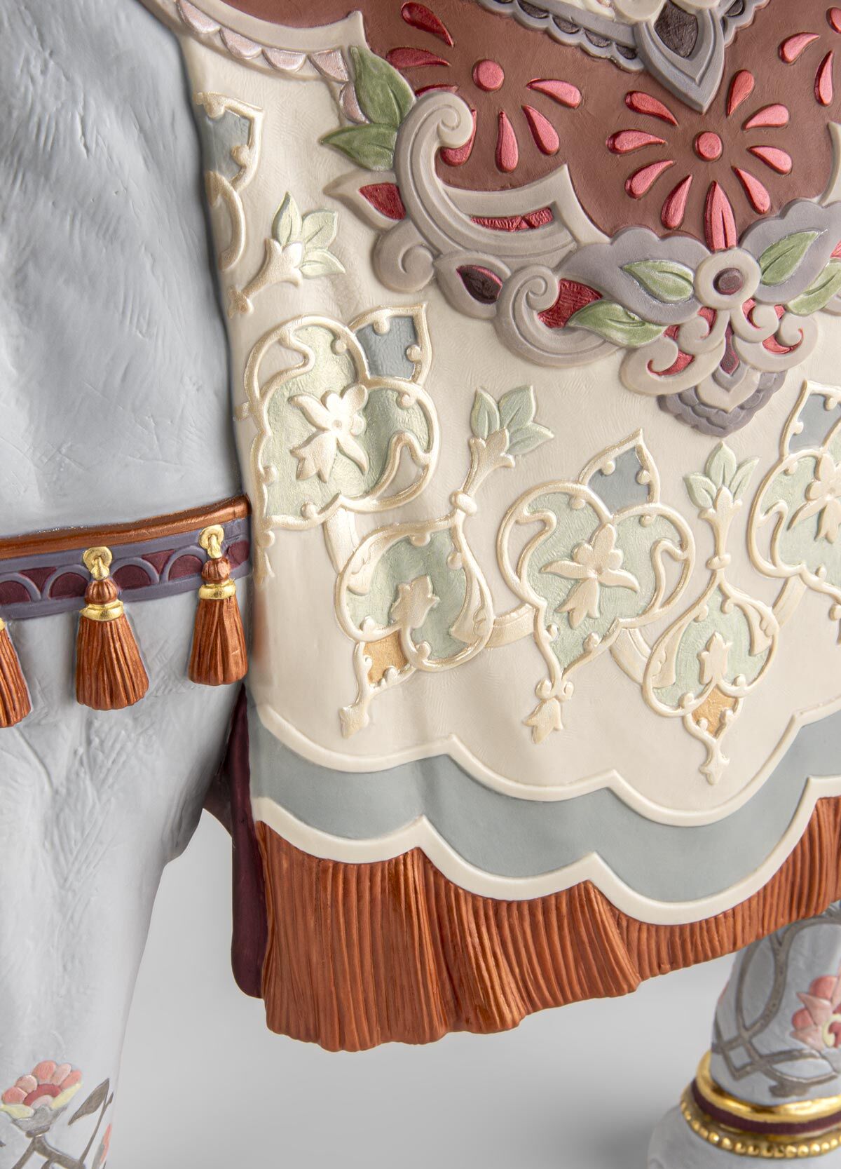 Un trabajo cromático que merece mención: se emplean 20 colores, aplicados con precisión, para enriquecer cada superficie con matices únicos. Tonos anaranjados, azul cobalto, verde esmeralda, lavanda o rosa se combinan con lustres dorados y acabados tornasolados, aportando riqueza visual. Destacan los flecos de porcelana teñidos en naranja y las guirnaldas con campanillas doradas que cuelgan del cuello y los flancos del animal, evocando los desfiles festivos y ceremoniales del sur de Asia. En las patas, delicados grabados florales continúan el lenguaje ornamental, reforzando la sensación de movimiento y armonía.