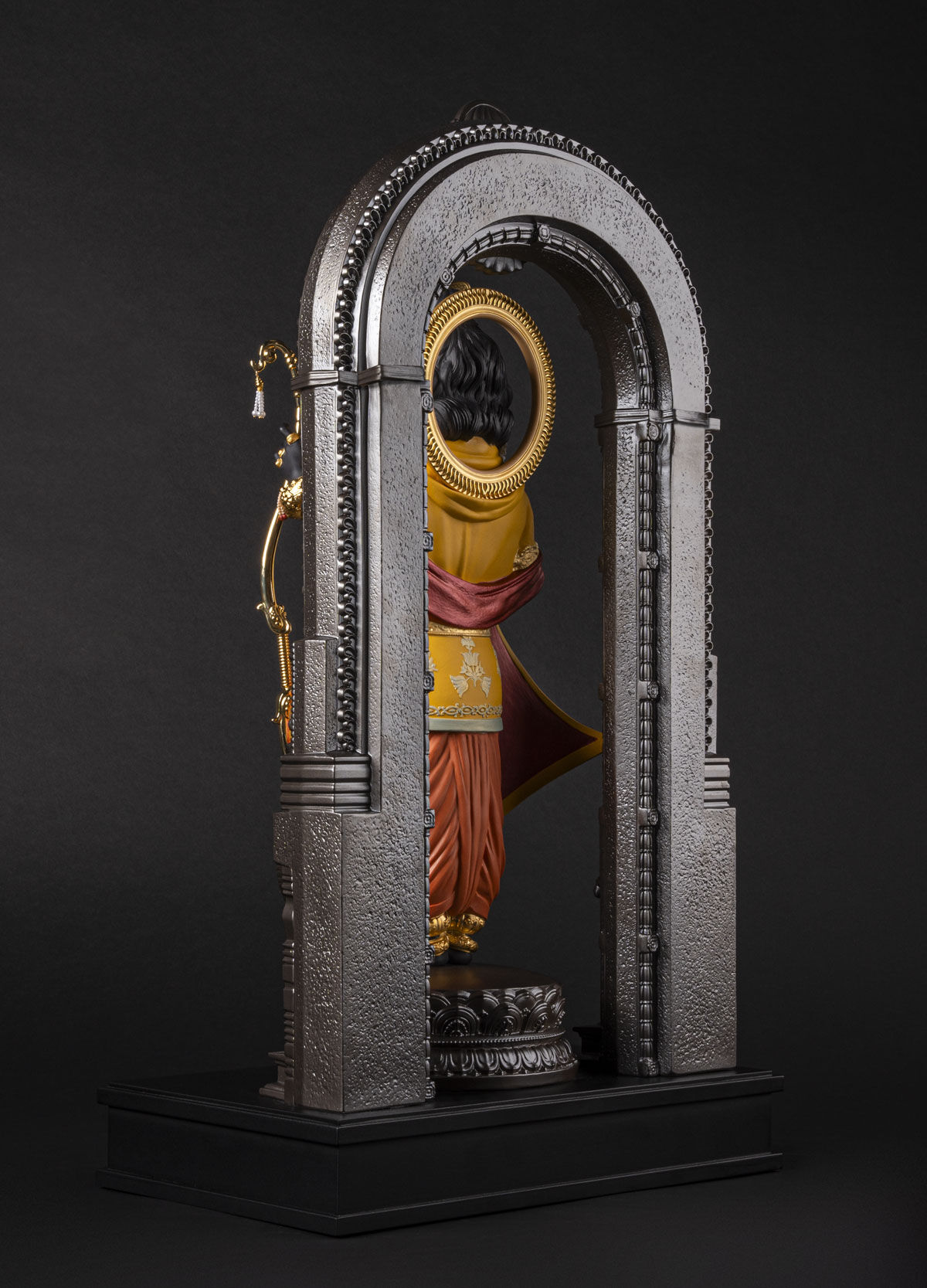 La pieza ha sido creada en colaboración con el escultor Dr. Arun Yogiraj, autor de la imagen consagrada en el templo de Ayodhya. Siguiendo los principios del Shilpa Shashtra, nuestro escultor Raúl Rubio ha reinterpretado fielmente su obra en porcelana, junto a los equipos de ornamentación y decoración.La inspiración proviene del templo, donde cada Ram Navami un rayo de sol ilumina la frente del dios: el Surya Tilak, símbolo de bendición y armonía cósmica.