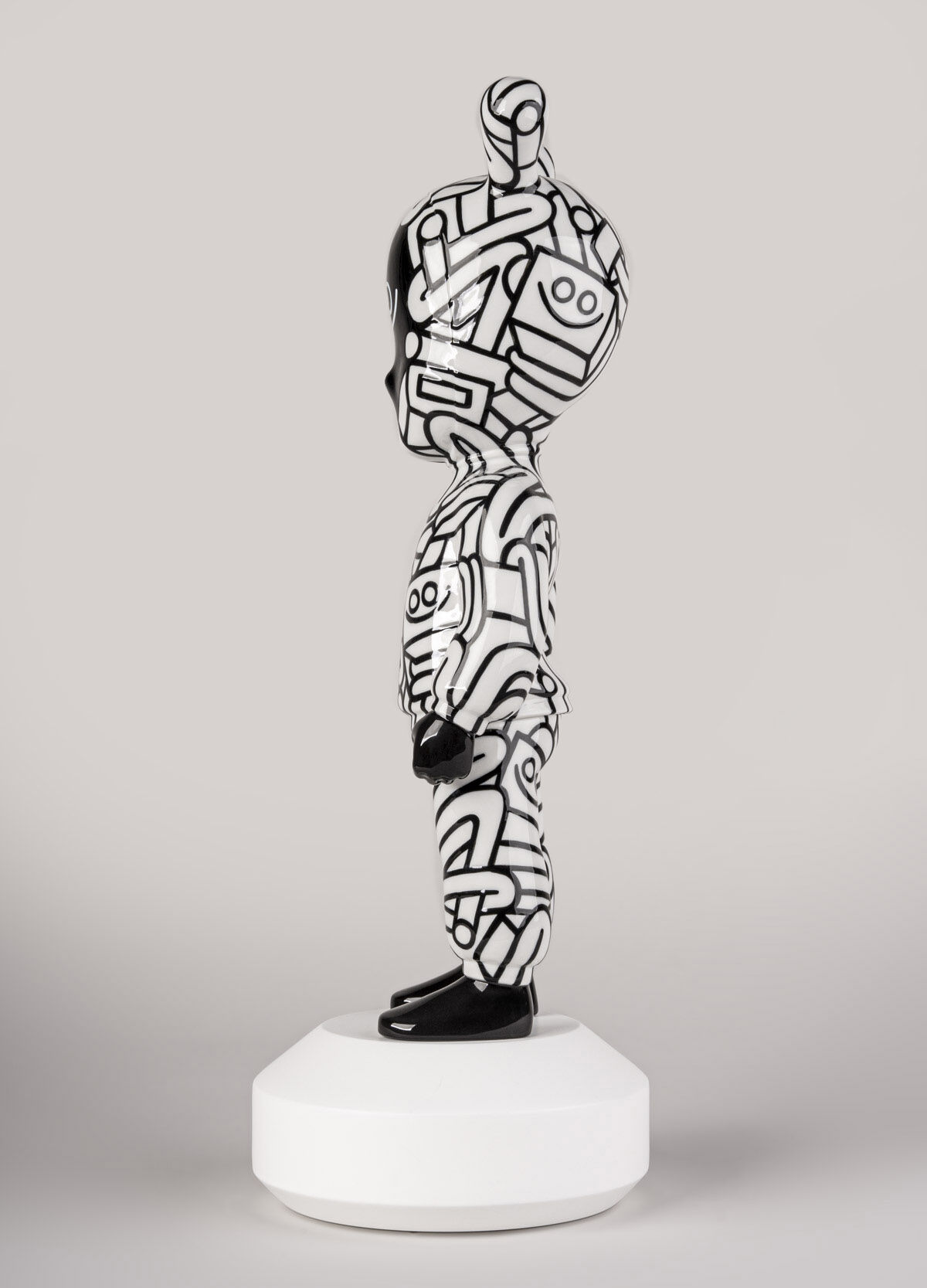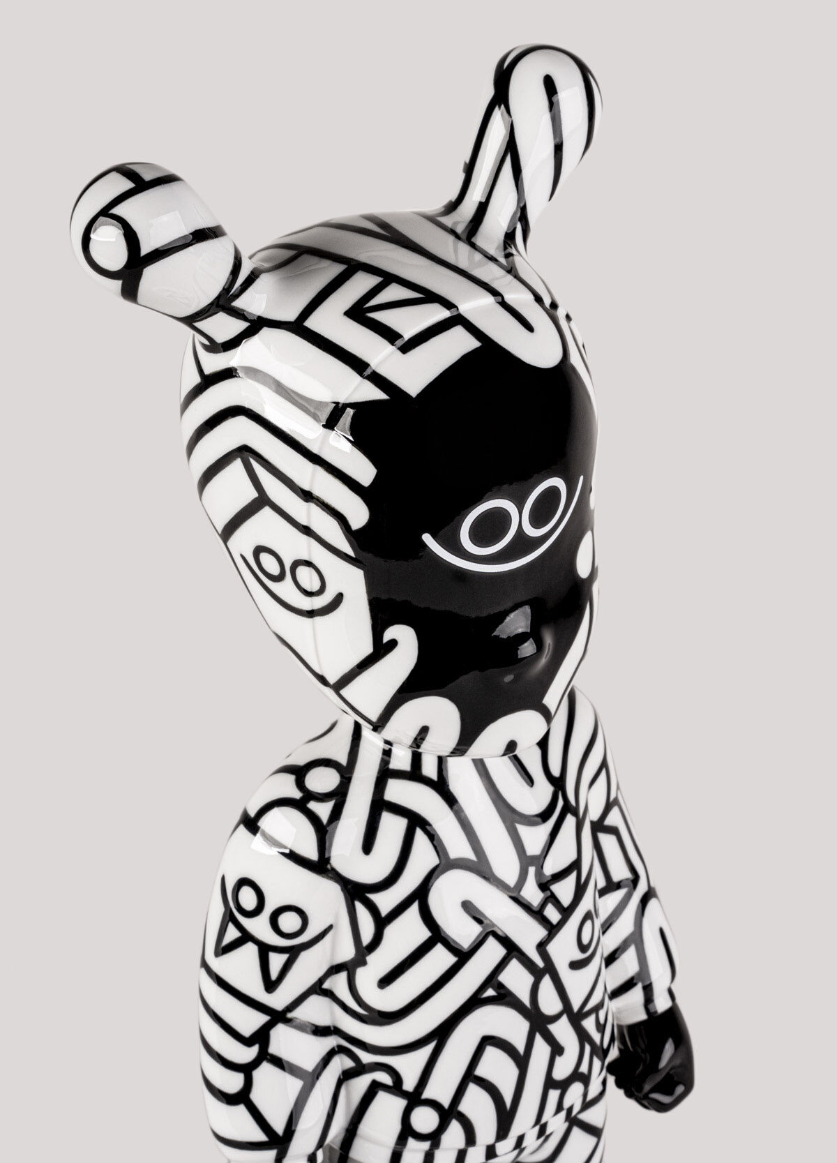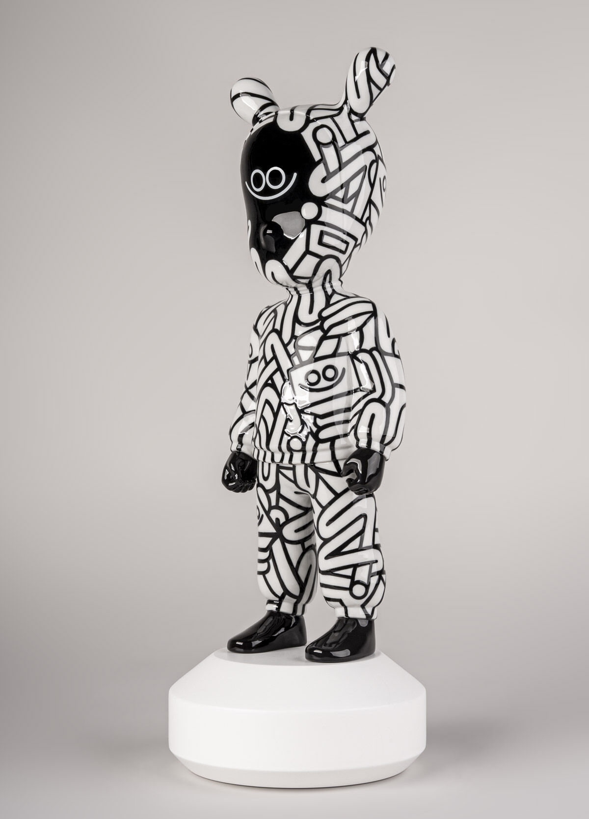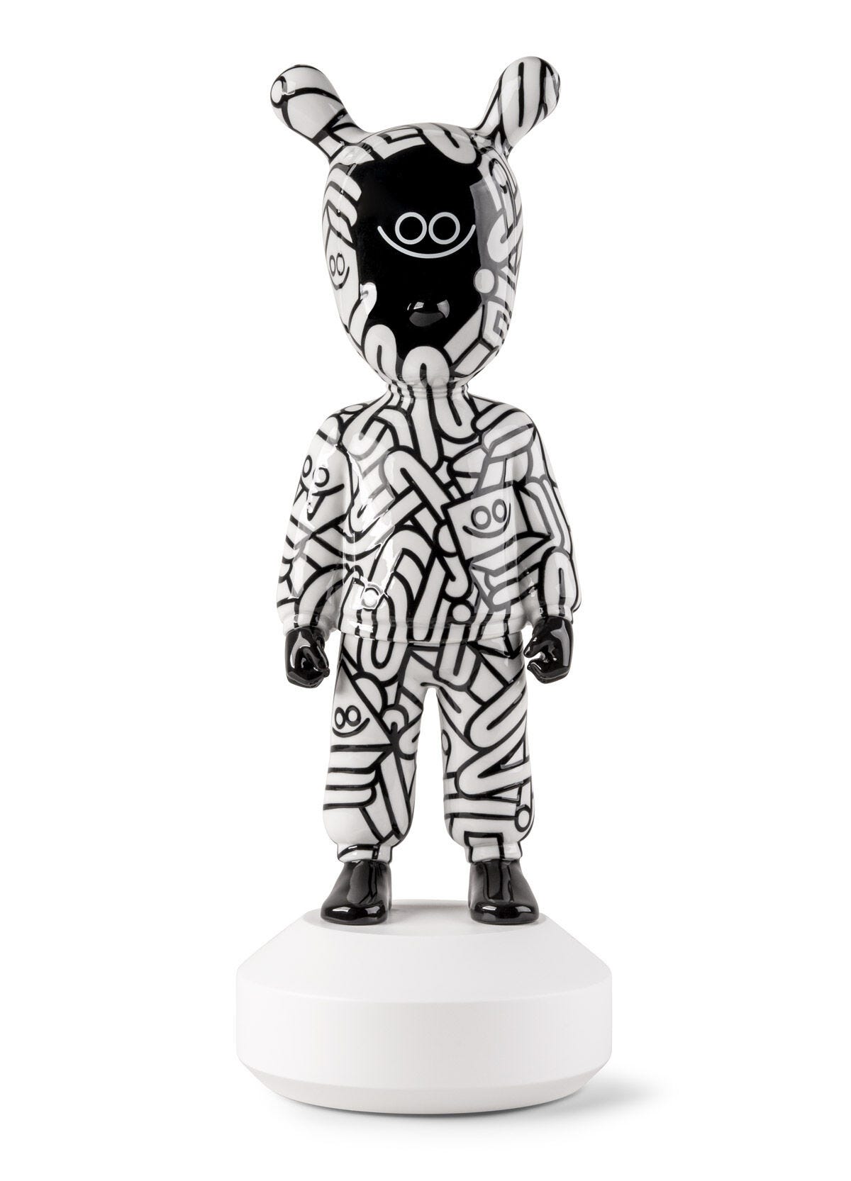 Esta edición limitada de 300 unidades lleva la firma creativa de Juan Díaz-Faes, artista, muralista e ilustrador conocido por su lenguaje visual amable y cercano. Realizada en porcelana y decorada a mano, presenta un entramado complejo de líneas en blanco y negro que recorre toda la superficie, transformando la silueta de The Guest en un soporte tridimensional para el imaginario más reconocible del artista.