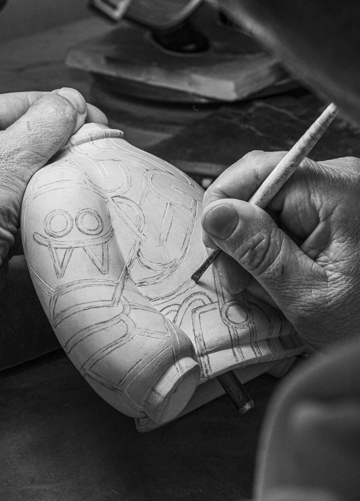 A través de formas geométricas, líneas envolventes y rostros en bucle, Díaz-Faes genera un efecto hipnótico y dinámico que parece cobrar movimiento sobre la pieza. El resultado es un paisaje gráfico que invita a ser observado desde todos los ángulos, uniendo técnica artesanal y fuerza visual en una propuesta rotundamente personal.