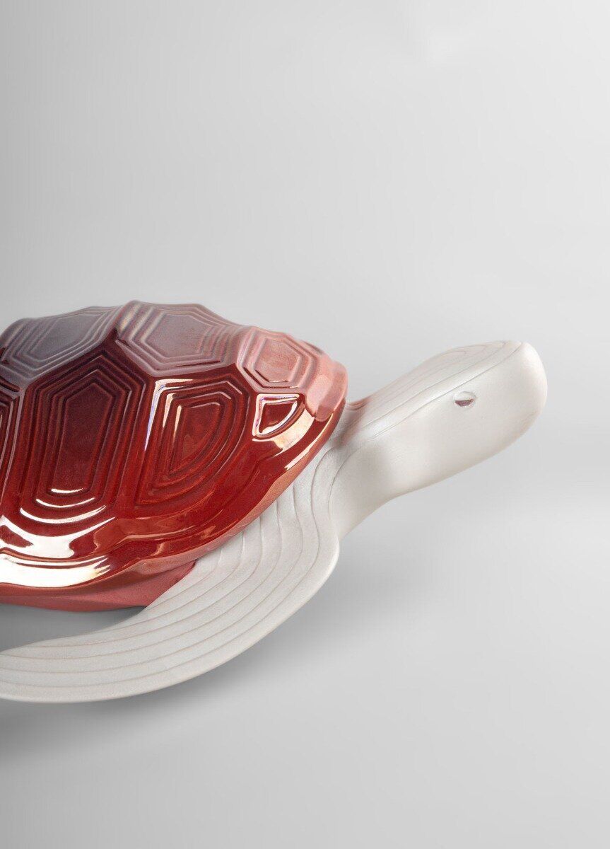 La tortuga es una criatura de movimientos lentos en tierra, pero rápidos y elegantes en el mar. Simboliza la paciencia, la sabiduría y la longevidad. En esta versión en porcelana, sus reconocidas formas se actualizan a través de un tratamiento más depurado con grabados geométricos. Un planteamiento contemporáneo que se completa con una decoración con rojos intensos. Un tributo a unos animales que llevan más de 200 millones de años habitando en la tierra, demostrando la importancia de la capacidad de adaptación a los cambios como garantía de supervivencia. Esta creación está disponible en dos tamaños.