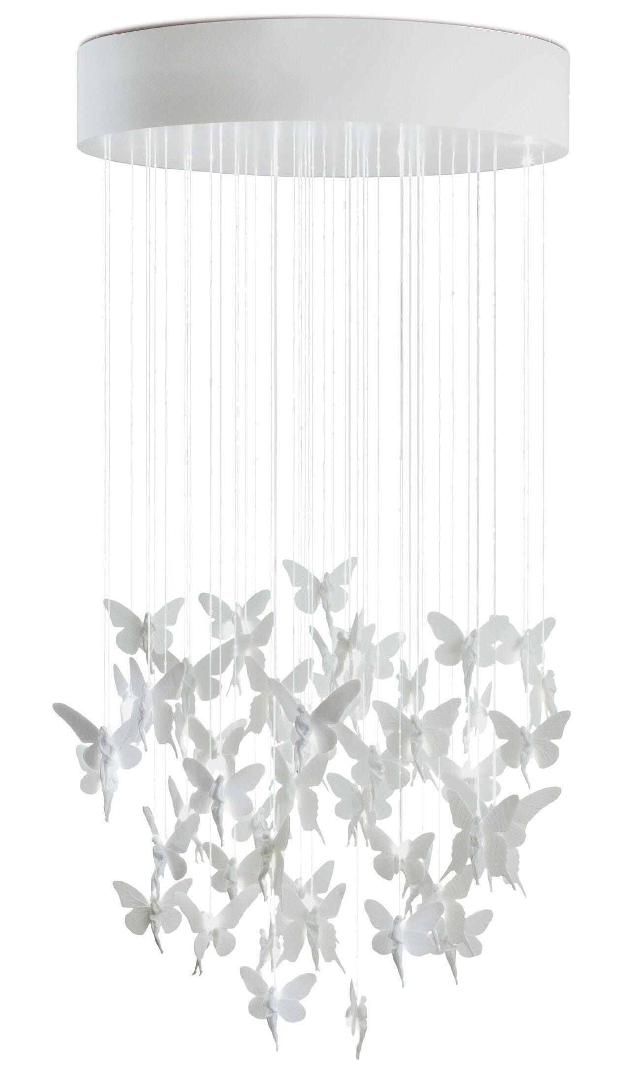 Dentro del proyecto Re-Cyclos, el creativo alemán Bodo Sperlein crea para Lladró, a partir de las icónicas hadas de la marca, unos chandeliers absolutamente contemporáneos con una nueva función y un nuevo mensaje. Cada una de estas hadas está hecha a mano, siguiendo el proceso enteramente artesanal inherente a Lladró. Creatividad en estado puro, que se combina con lo último en tecnología en fibra óptica para crear sutiles puntos de luz que caen en forma de cascada y hacen que las hadas cobren vida. Disponible en 0,60 m, 0,80 m, 1,35 m y 2,00 m