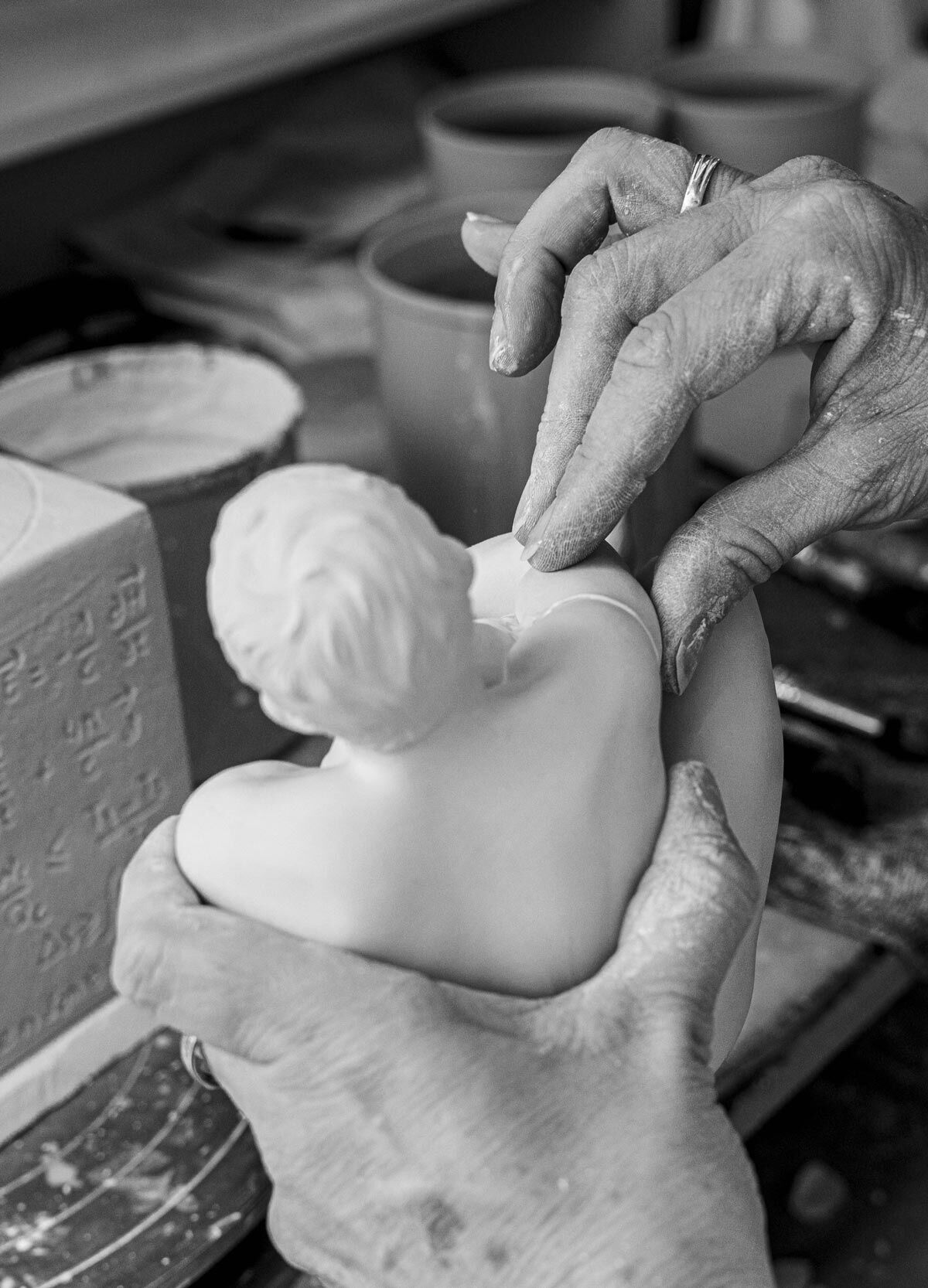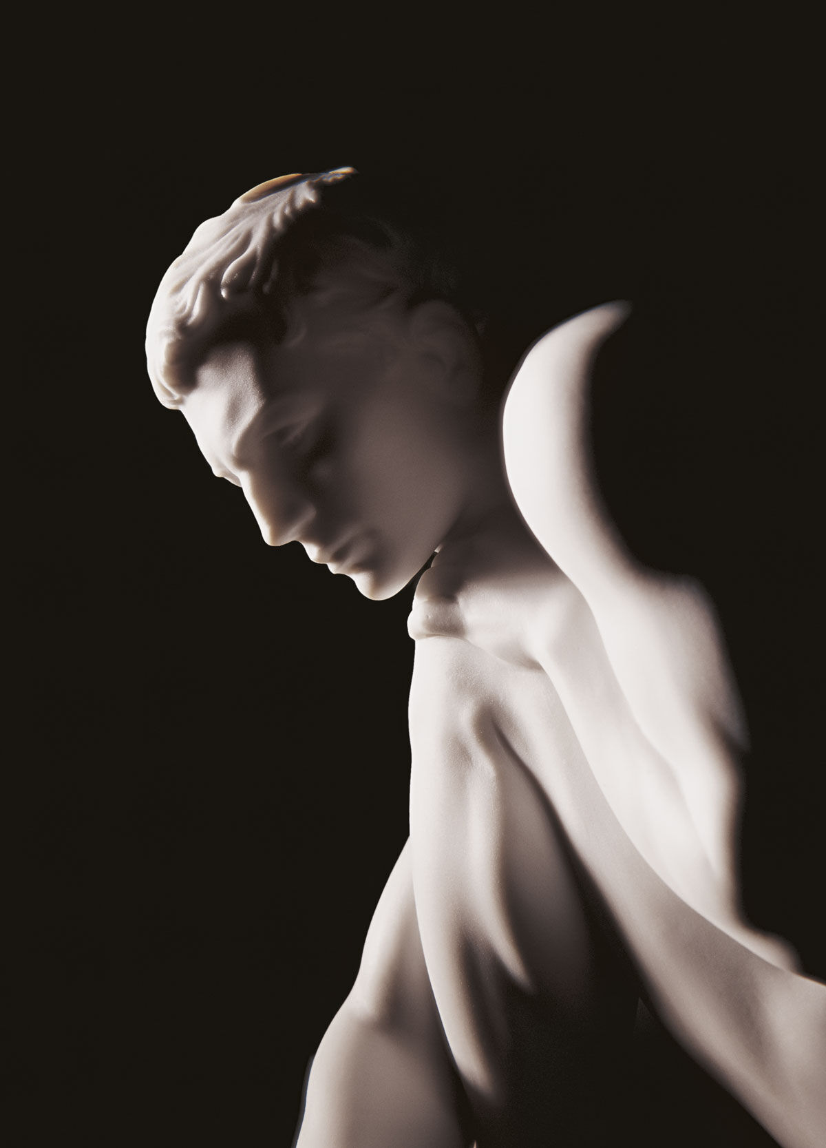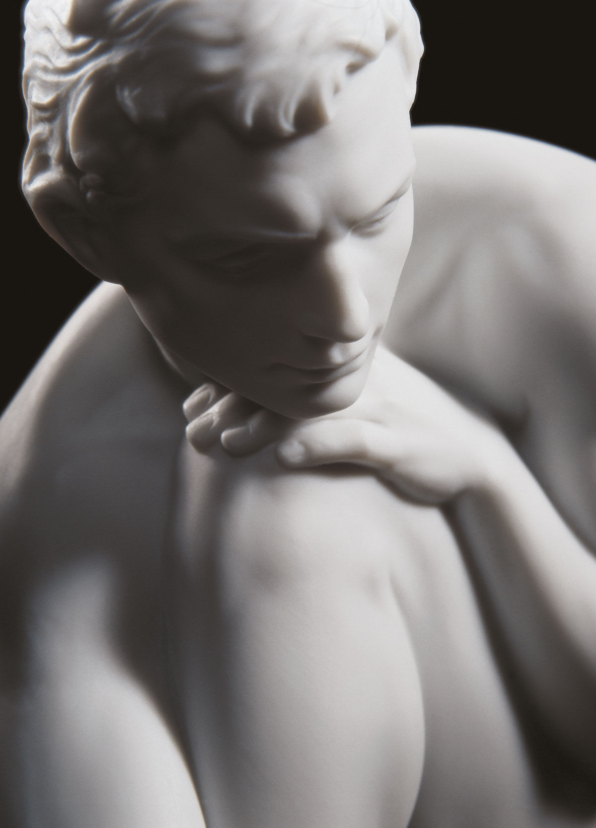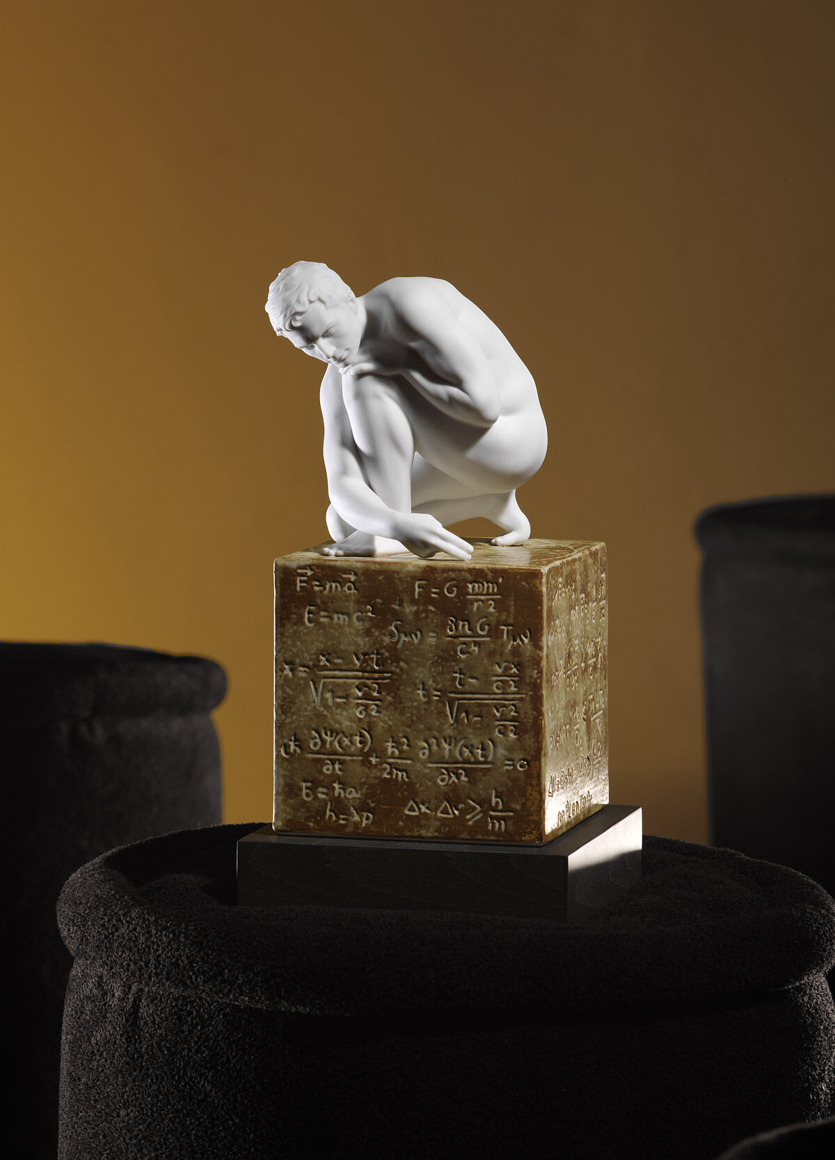 Figura di uomo nudo, in porcellana bianca opaca, chino su un cubo decorato con smalti ocra e con disegni di formule matematiche.