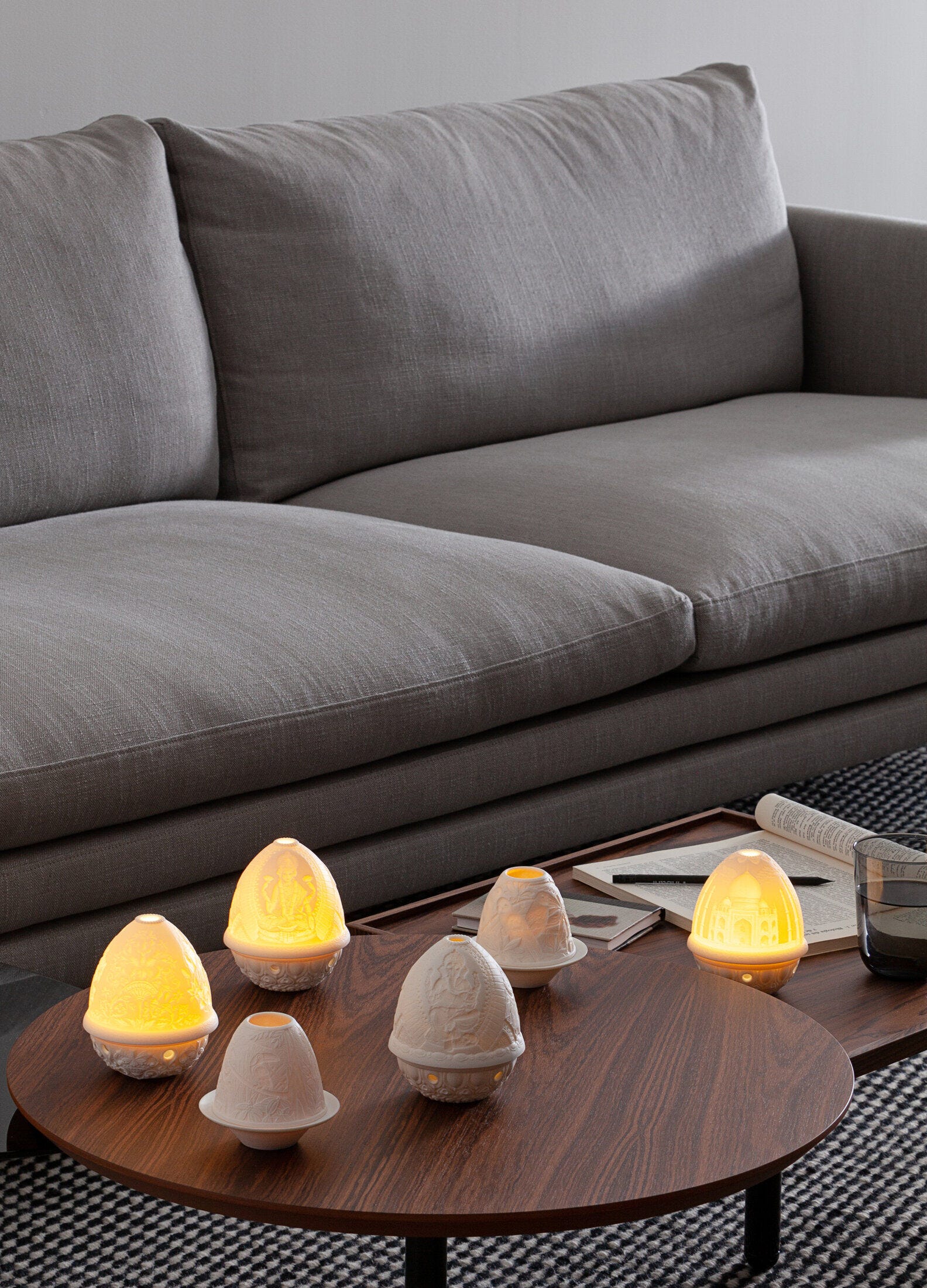 La magia della litofania nasce dal gioco di luci con il carattere traslucido della porcellana. Illuminando il suo interno, proietta un'illuminazione calda in tutta la stanza ed evidenzia l'incisione che lo decora, producendo sorprendenti effetti di rilievo sulla sua superficie. Questo pezzo rappresenta la dea Lakshmi, simbolo di purezza, che trasmette un profondo simbolismo spirituale con la bellezza serena del suo viso. È anche la dea della fortuna e della prosperità, una delle più amate nelle case indù.