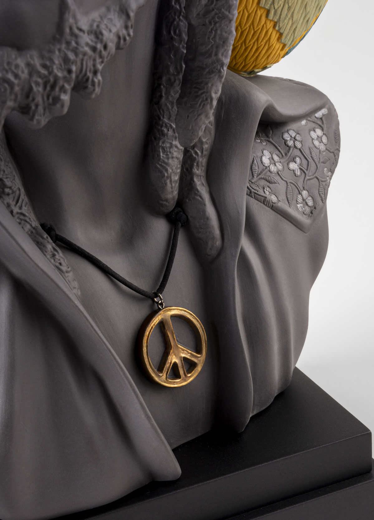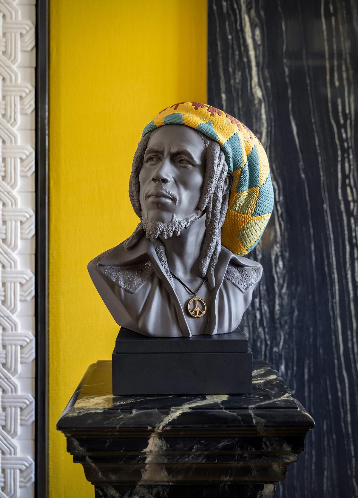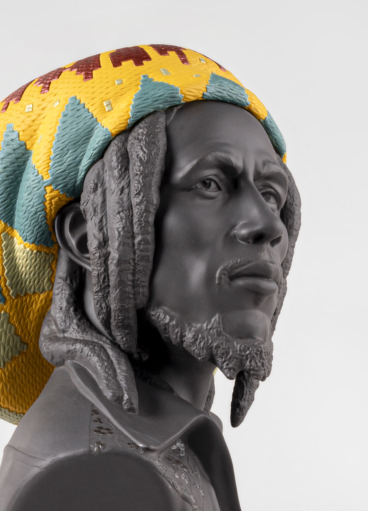 Questo ritratto del cantante, realizzato a mano in porcellana nera opaca, fa parte di un'edizione limitata di 250 unità. Particolarmente degni di nota sono la modellazione realistica e la sua ornamentazione. La texture del berretto, ricreata con precisione, è decorata con gli inconfondibili colori della cultura rastafari, un movimento spirituale che ha plasmato il pensiero e la musica del cantante. I risvolti della camicia sono impreziositi da dettagli in argento, mentre il ciondolo con il simbolo della pace rafforza il messaggio che l'artista ha promosso nel corso degli anni.