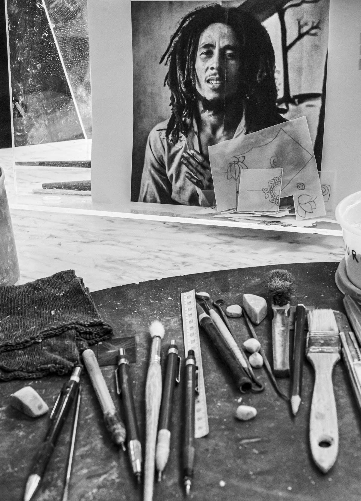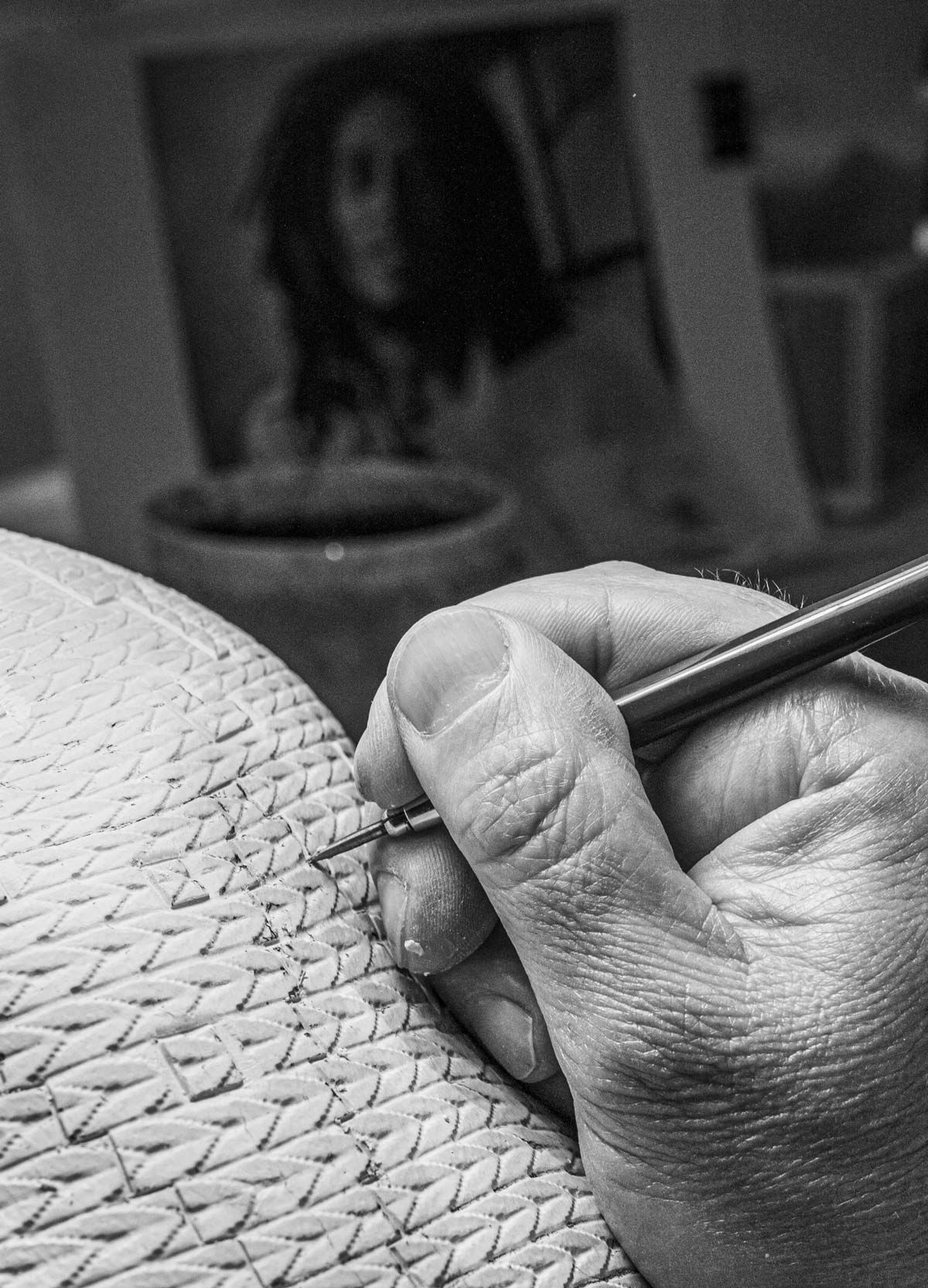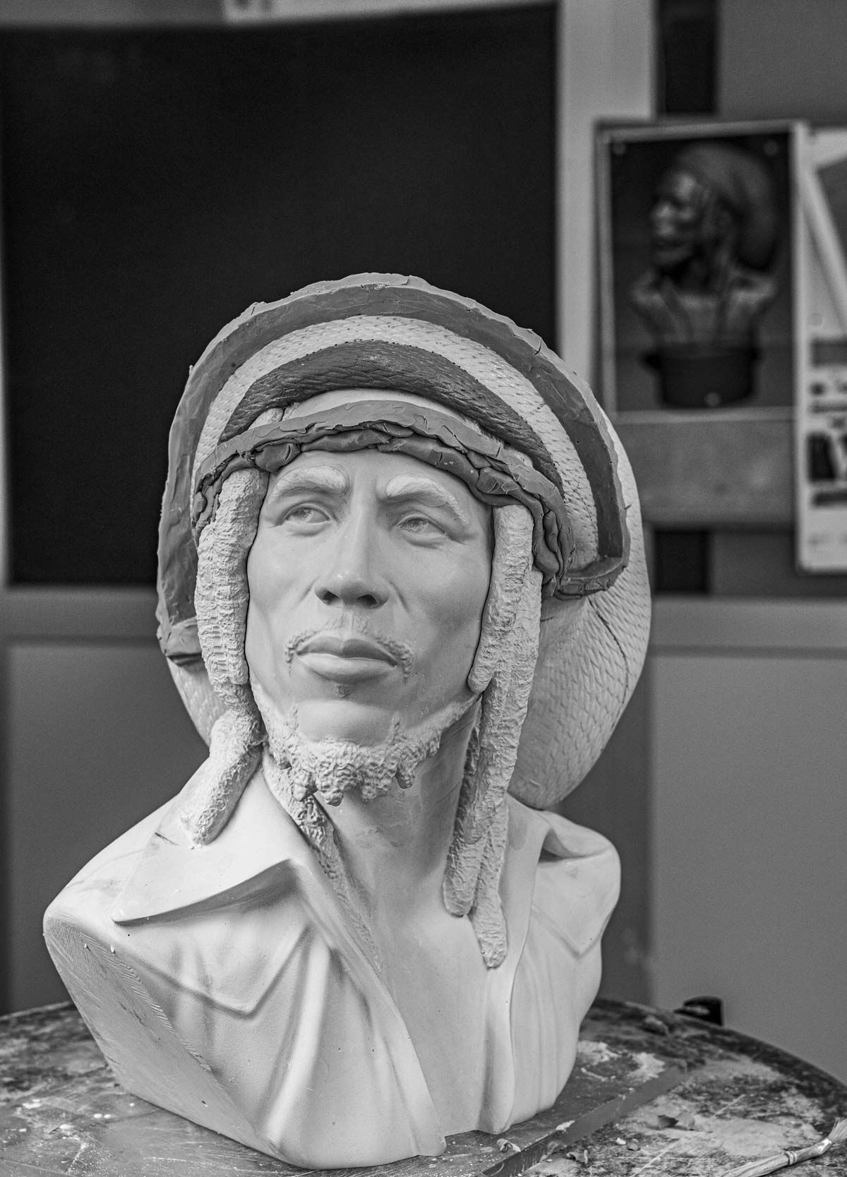 Questo ritratto del cantante, realizzato a mano in porcellana nera opaca, fa parte di un'edizione limitata di 250 unità. Particolarmente degni di nota sono la modellazione realistica e la sua ornamentazione. La texture del berretto, ricreata con precisione, è decorata con gli inconfondibili colori della cultura rastafari, un movimento spirituale che ha plasmato il pensiero e la musica del cantante. I risvolti della camicia sono impreziositi da dettagli in argento, mentre il ciondolo con il simbolo della pace rafforza il messaggio che l'artista ha promosso nel corso degli anni.
