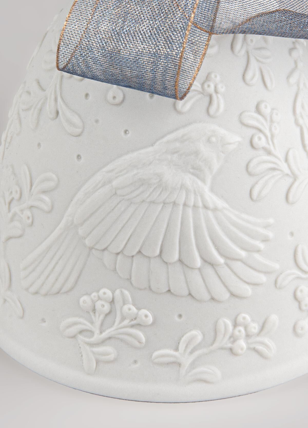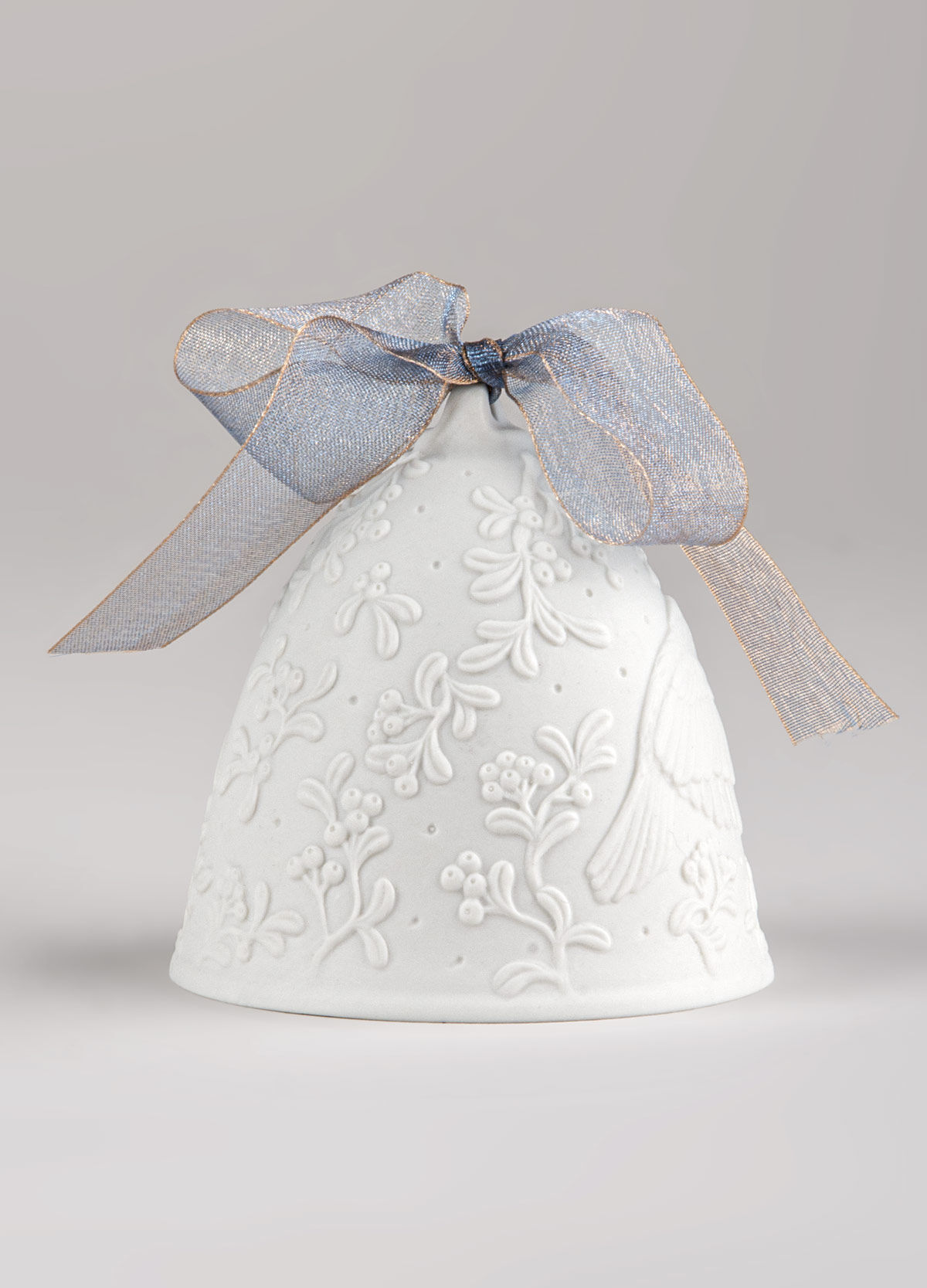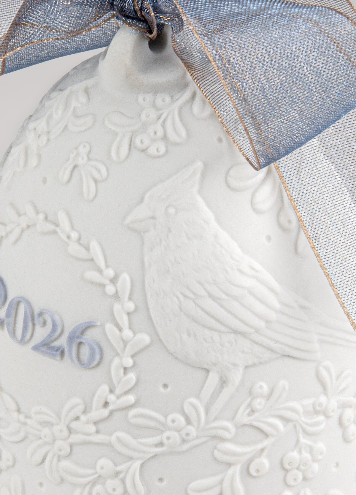 ヒイラギの浮き彫りと2026年の年号がソフトパステル調で施されたポーセリンのベル。吊るすための青いリボンが付いています。