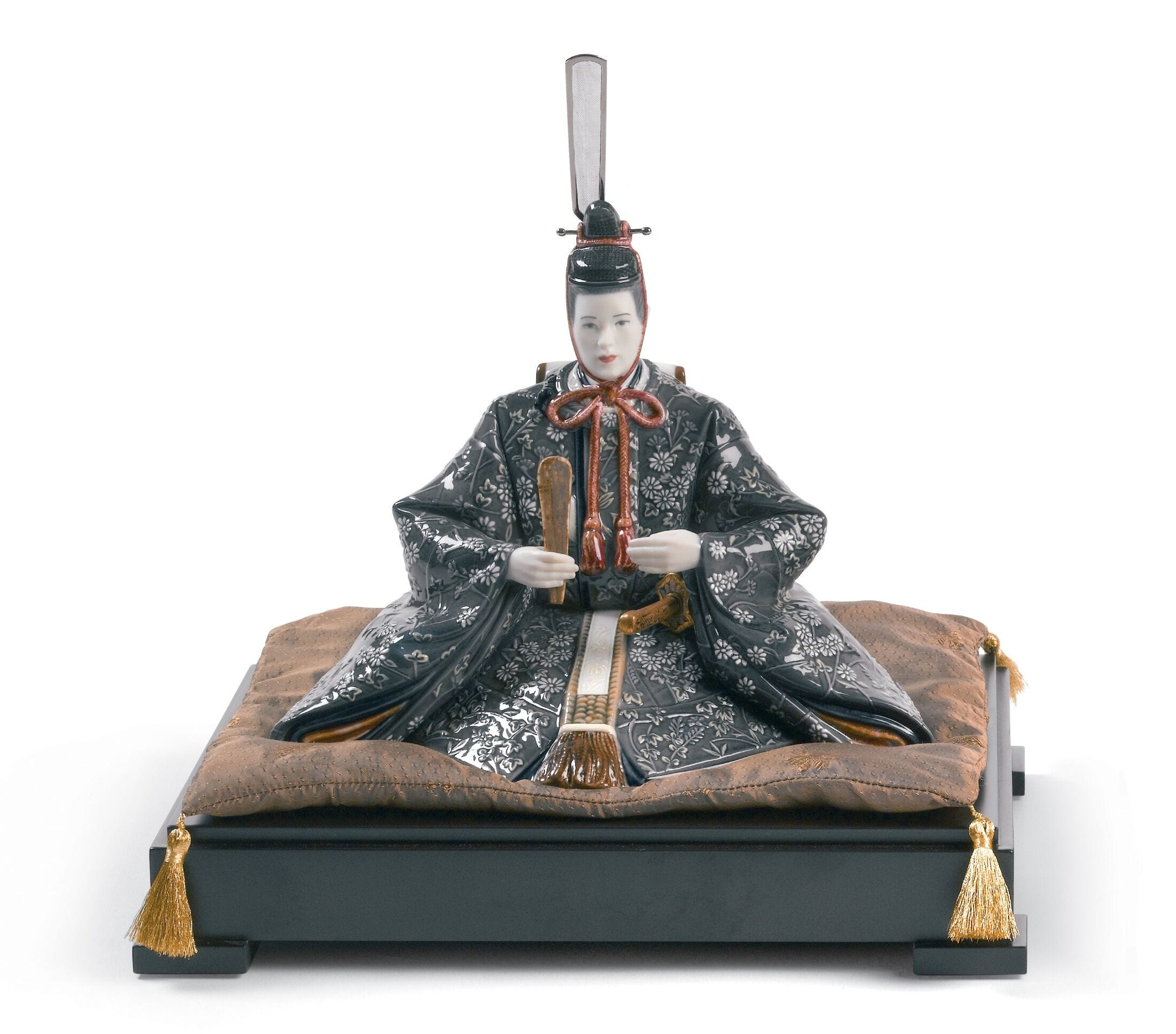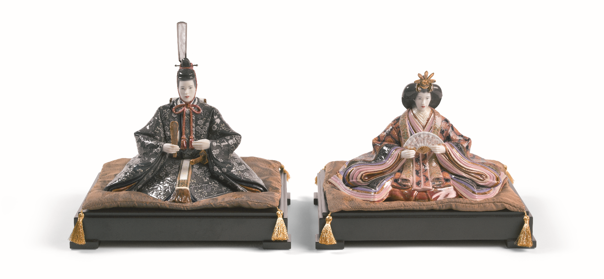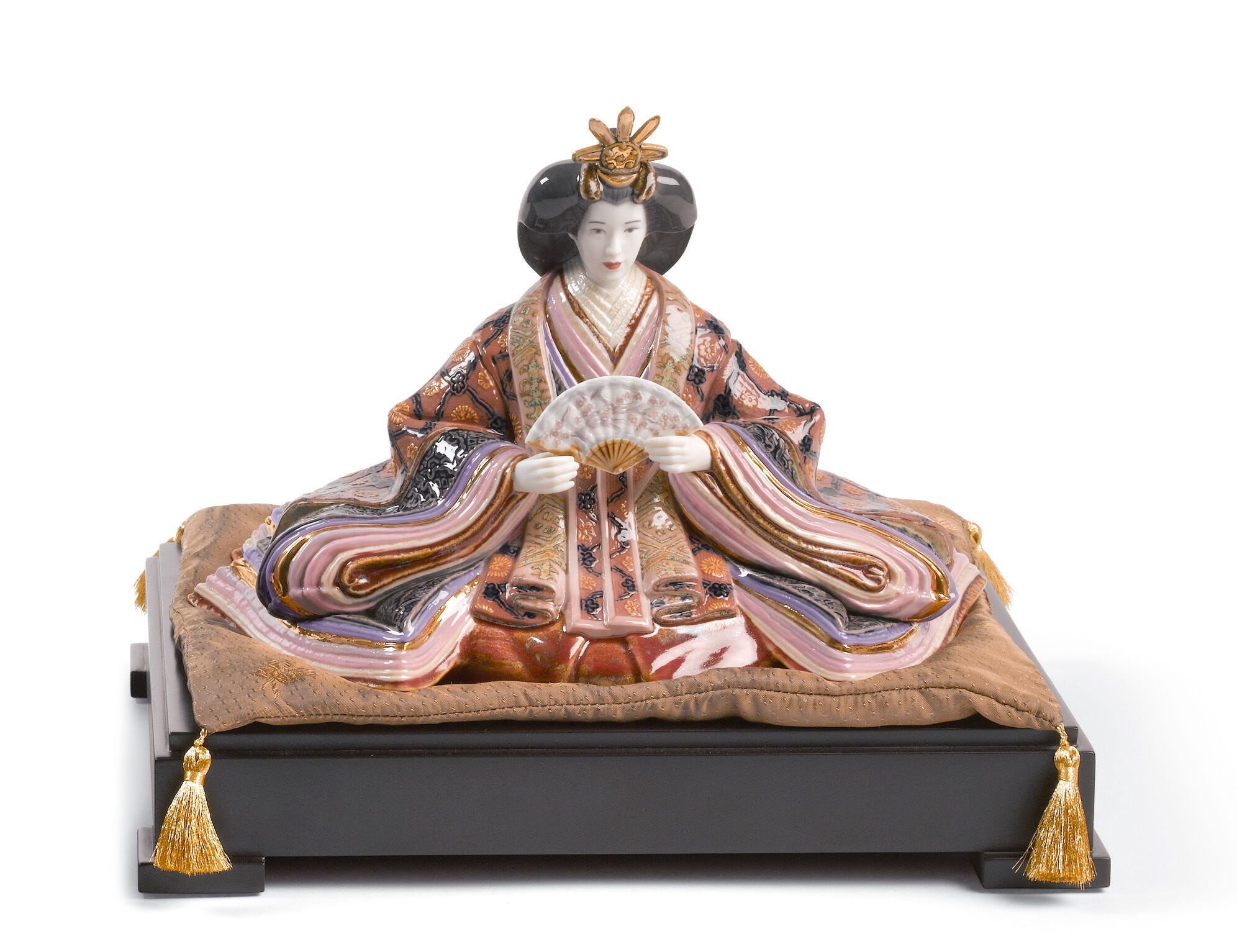また、内親王の着物にはより鮮やかな色合いが用いられ、重なった衣の様々な色合いは手作業で綿密に塗られています。 冠には手の込んだ金彩が施されて、作品の豪華さを添えています。専用の座布団と台座に飾ることで格調高く飾っていただけます。 お手入れも簡単で永くお楽しみいただけるリヤドロの雛人形。