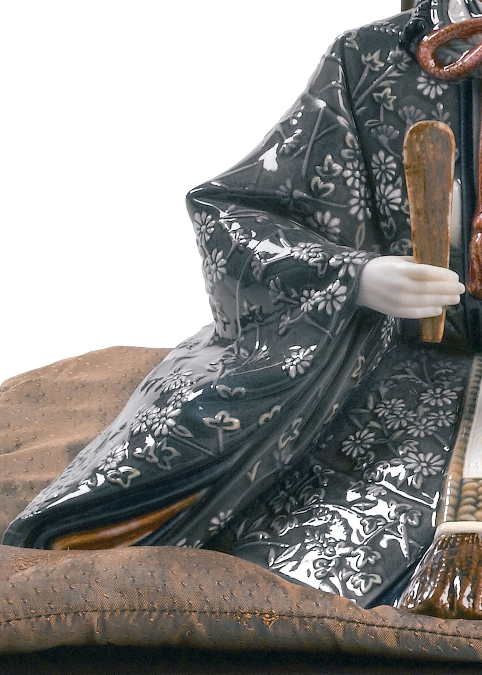 彫刻家Alfredo Llorens(1968年)により作られた作品を元に、ハイポーセリンの技術と表現を駆使して制作されました。すべてのハイポーセリン・コレクション同様、この作品も手の込んだ装飾がふんだんにあしらわれた、ポーセリン芸術の枠を究めた逸品です。 色彩は従来のリヤドロらしい淡い色ではなく、落ち着いた暗色が用いられ、着物の柄として描かれている細やかな花の模様などは手作業で綿密に仕上げられています。
