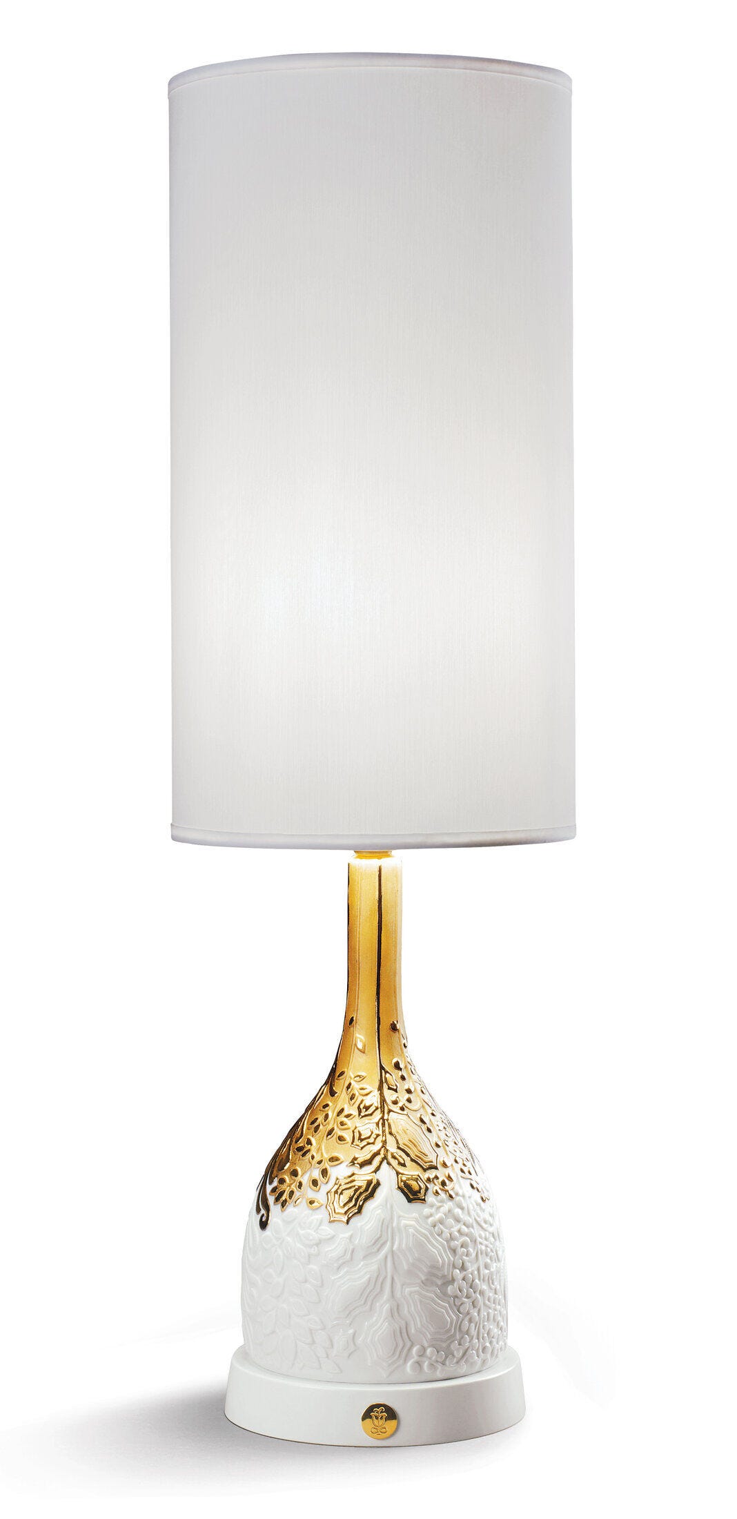 金色の光沢を持つ白磁のデザインテーブルランプ。自然をモチーフとした手作りの装飾が施されています。